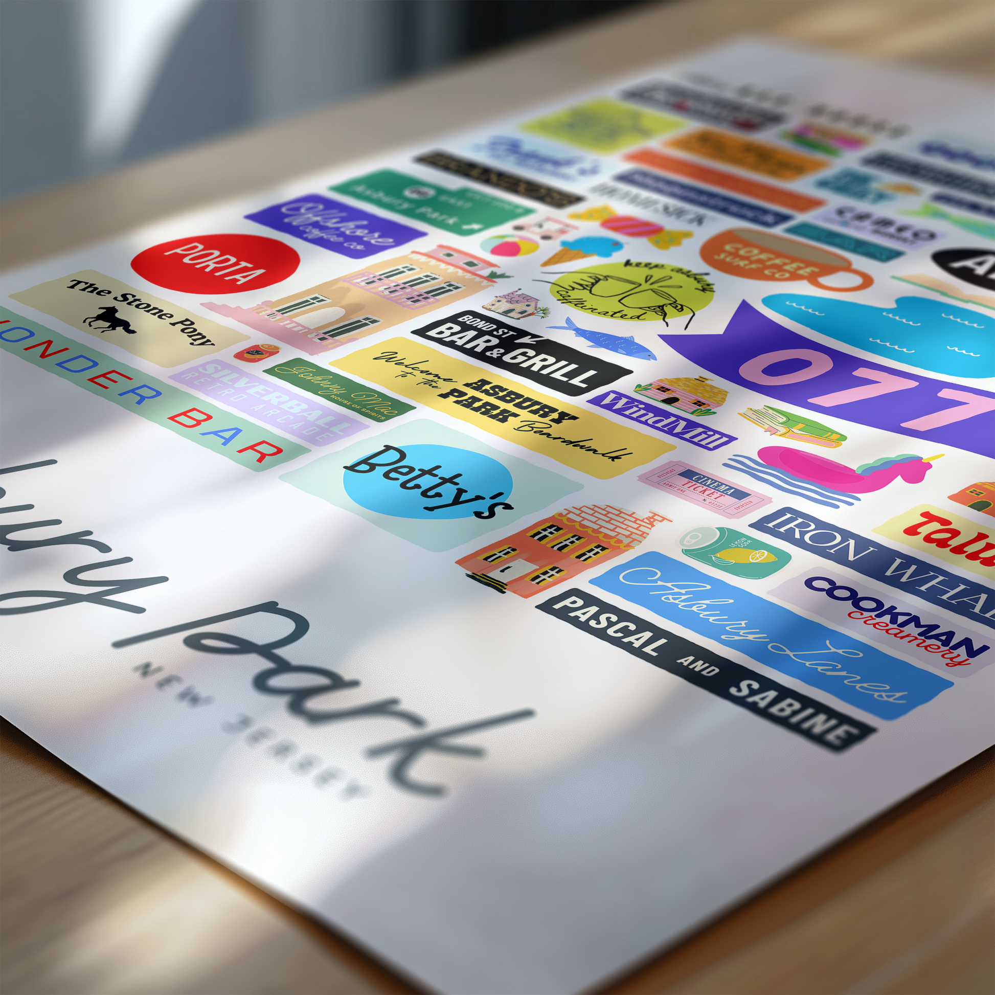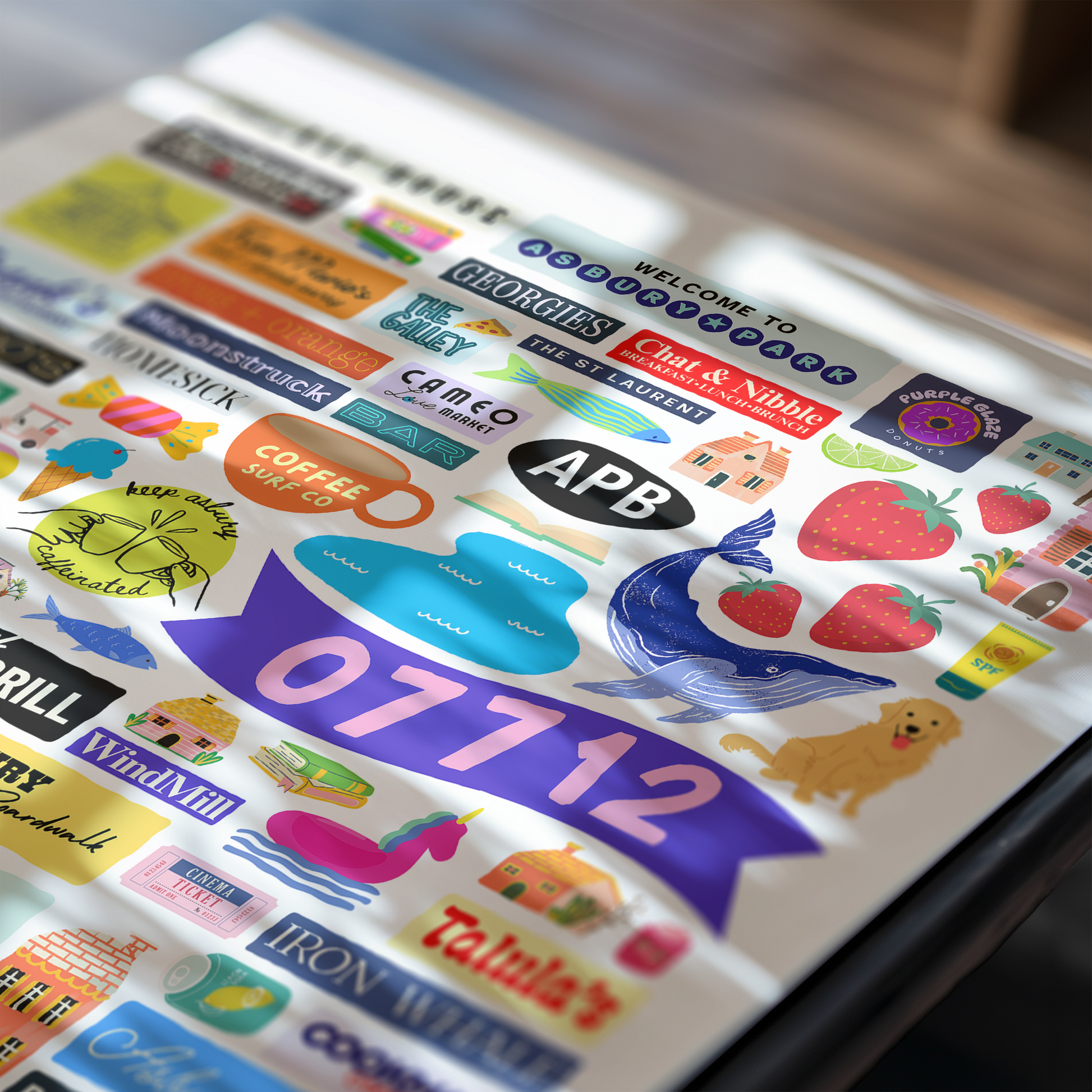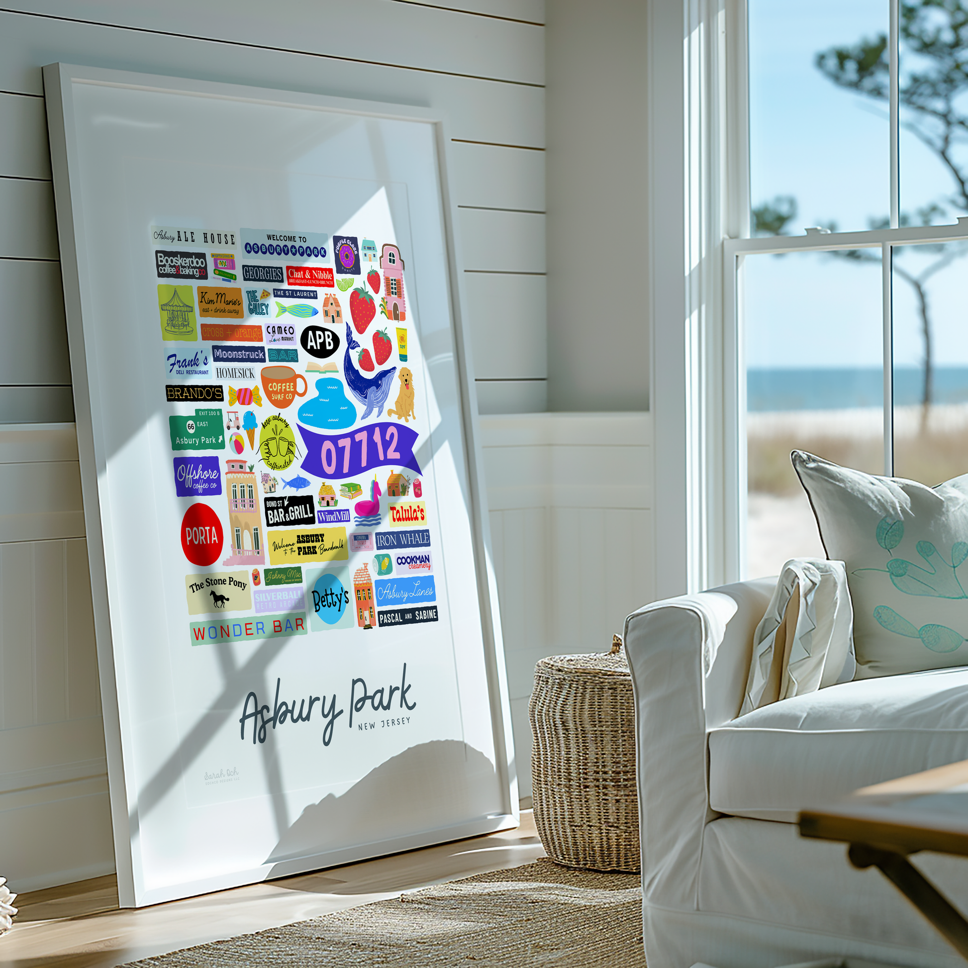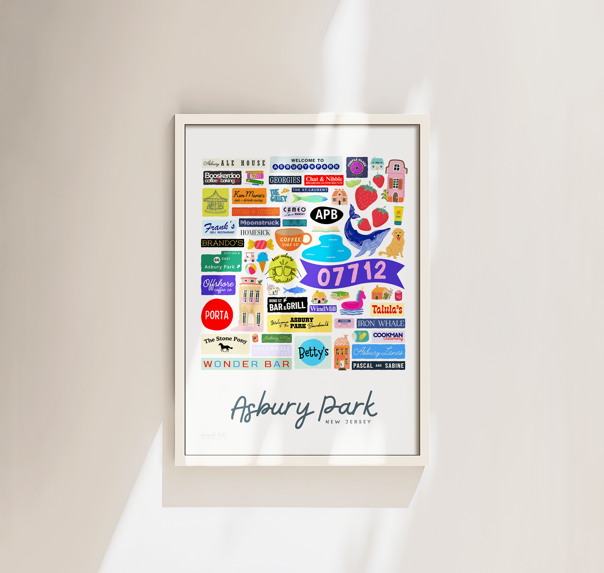 Colorful, custom-designed print featuring local attractions. All prints are printed on glossy photo paper. All framed prints come in a lightweight, white frame.