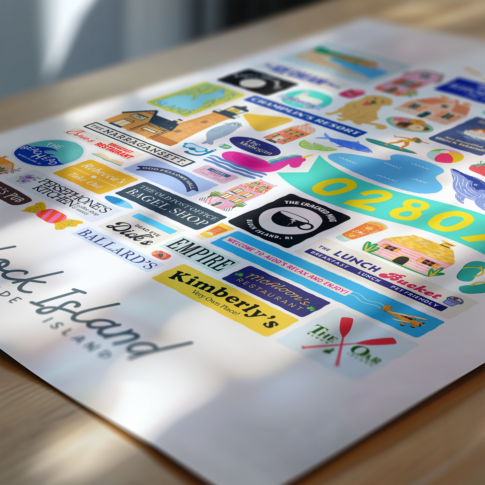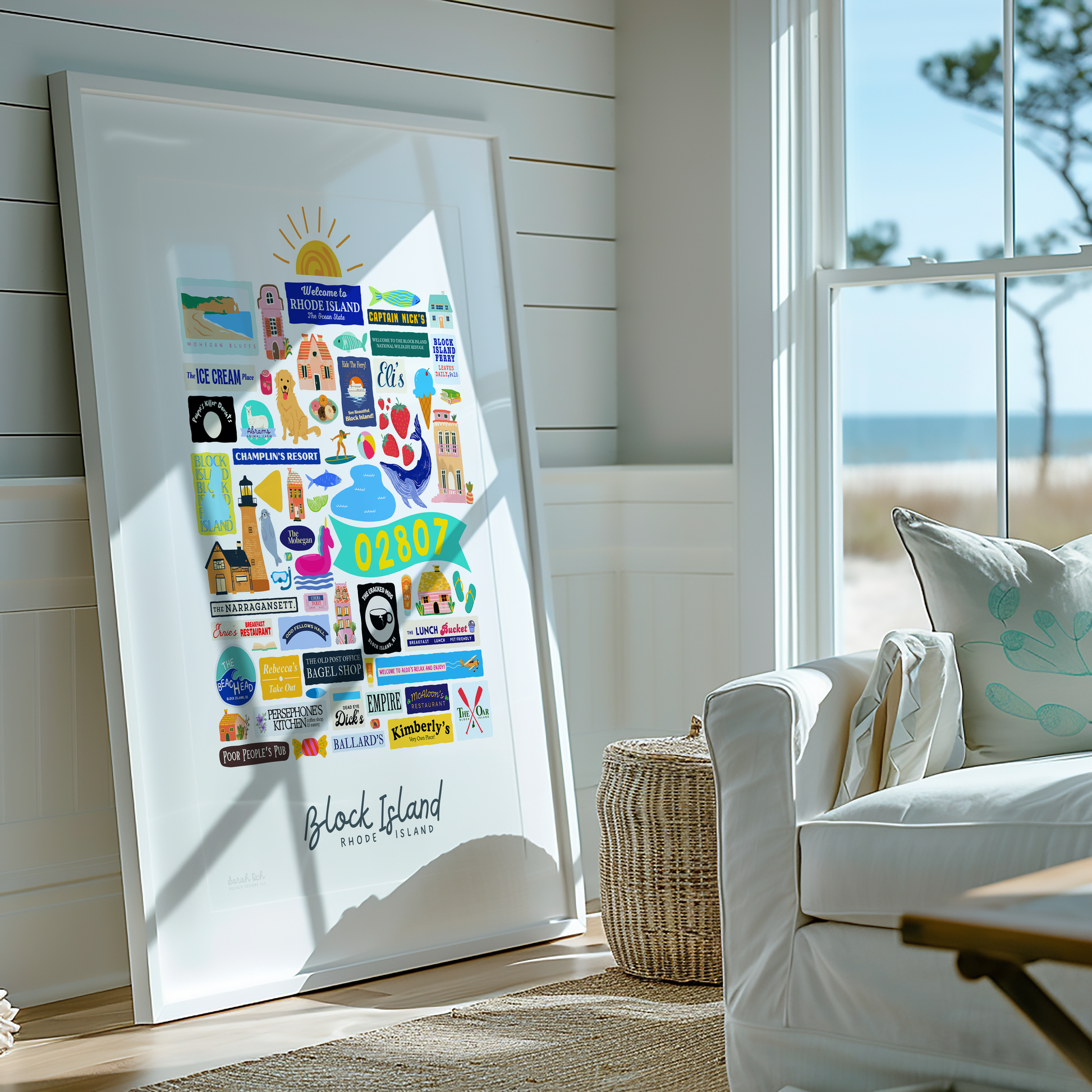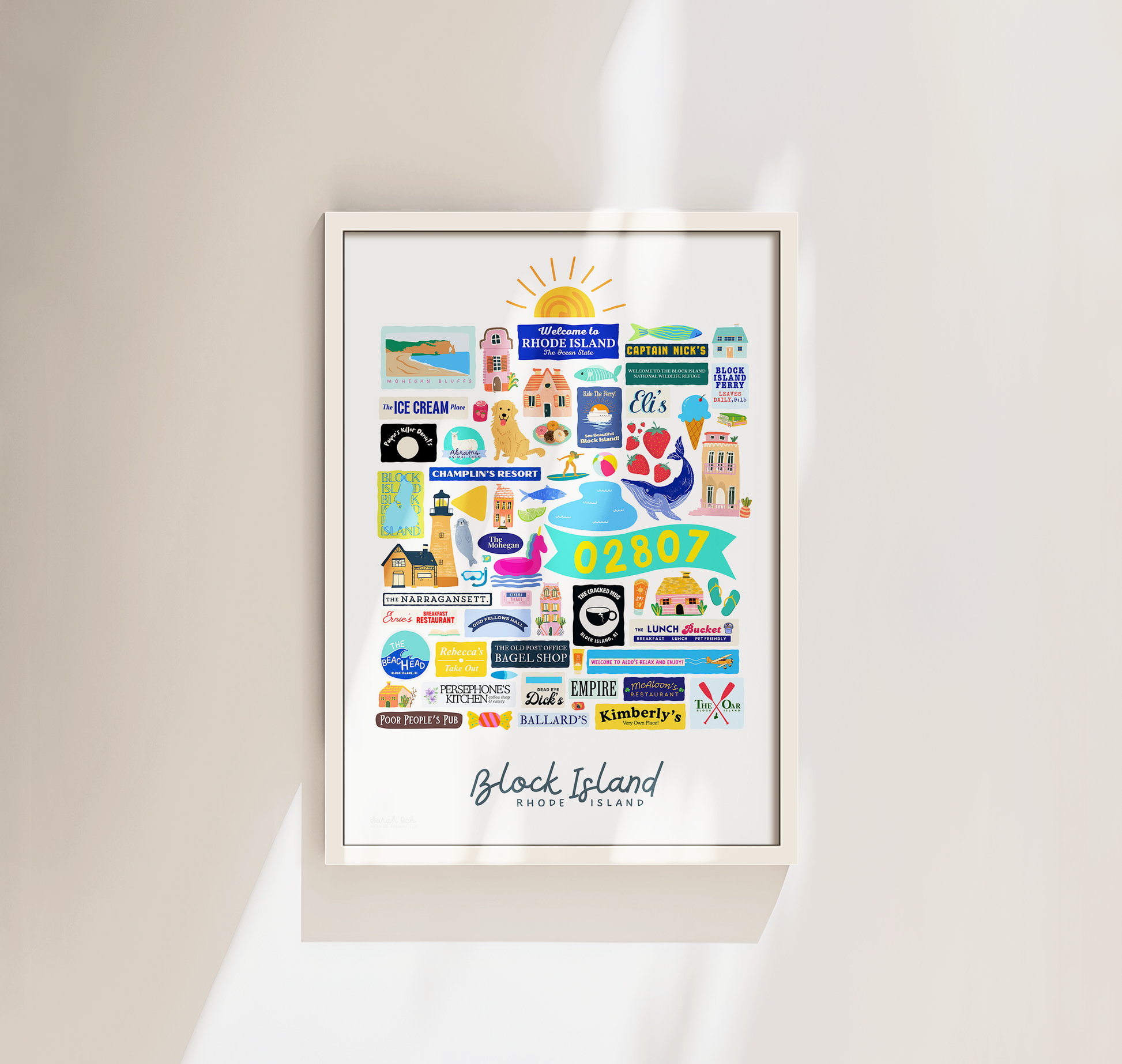 Colorful, custom-designed print featuring local attractions. All prints are printed on glossy photo paper. All framed prints come in a lightweight, white frame.