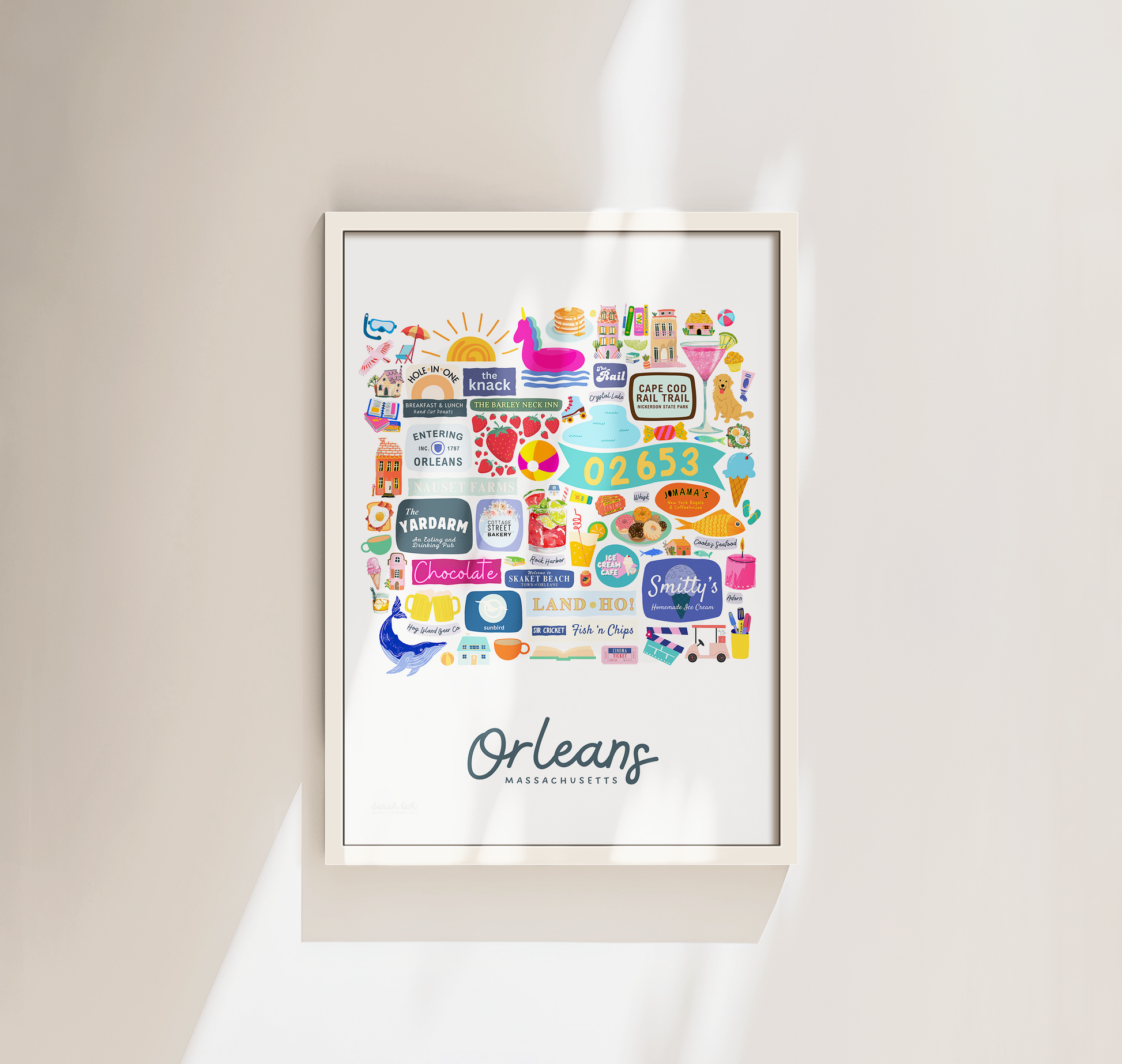 Colorful, custom-designed print featuring local attractions. All prints are printed on glossy photo paper. All framed prints come in a lightweight, white frame.