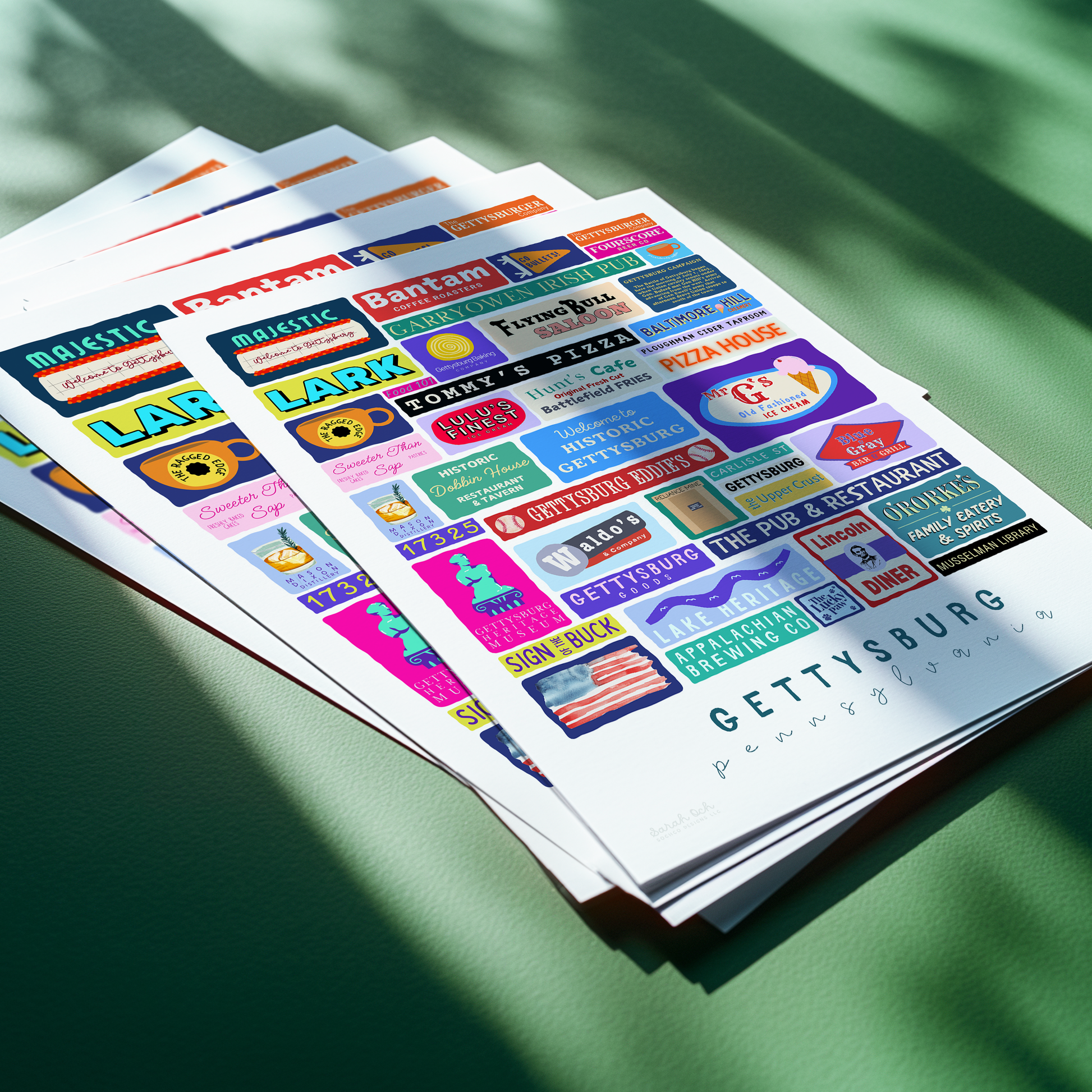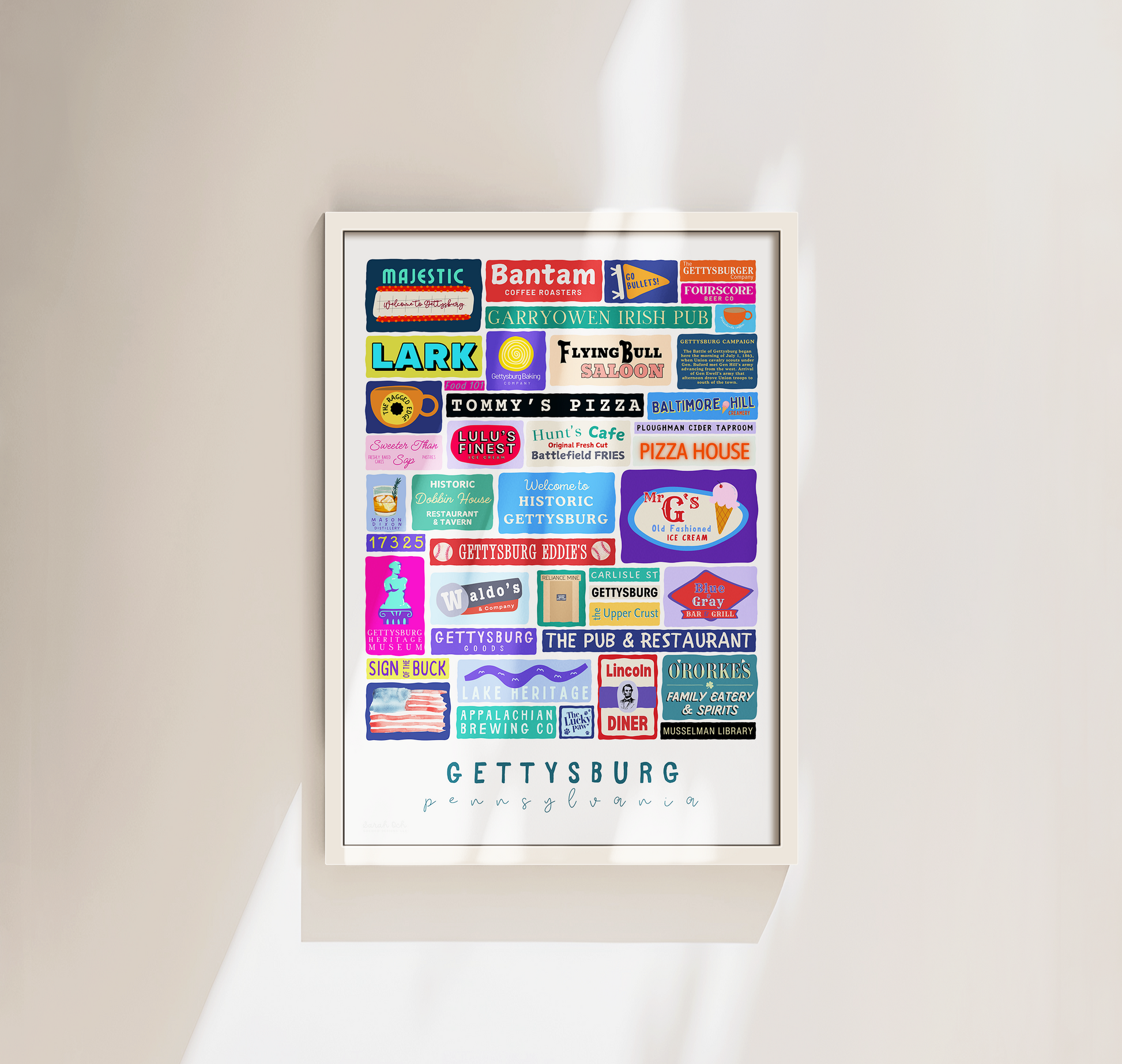 Colorful, custom-designed print featuring local attractions. All prints are printed on glossy photo paper. All framed prints come in a lightweight, white frame.