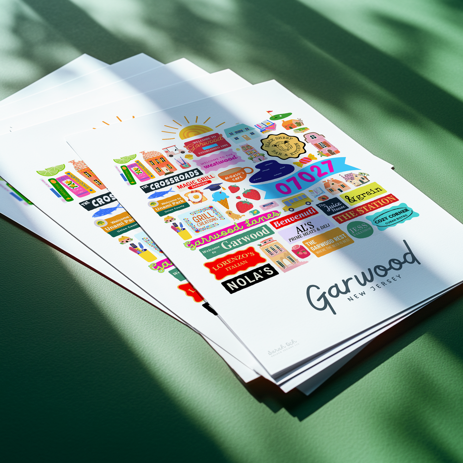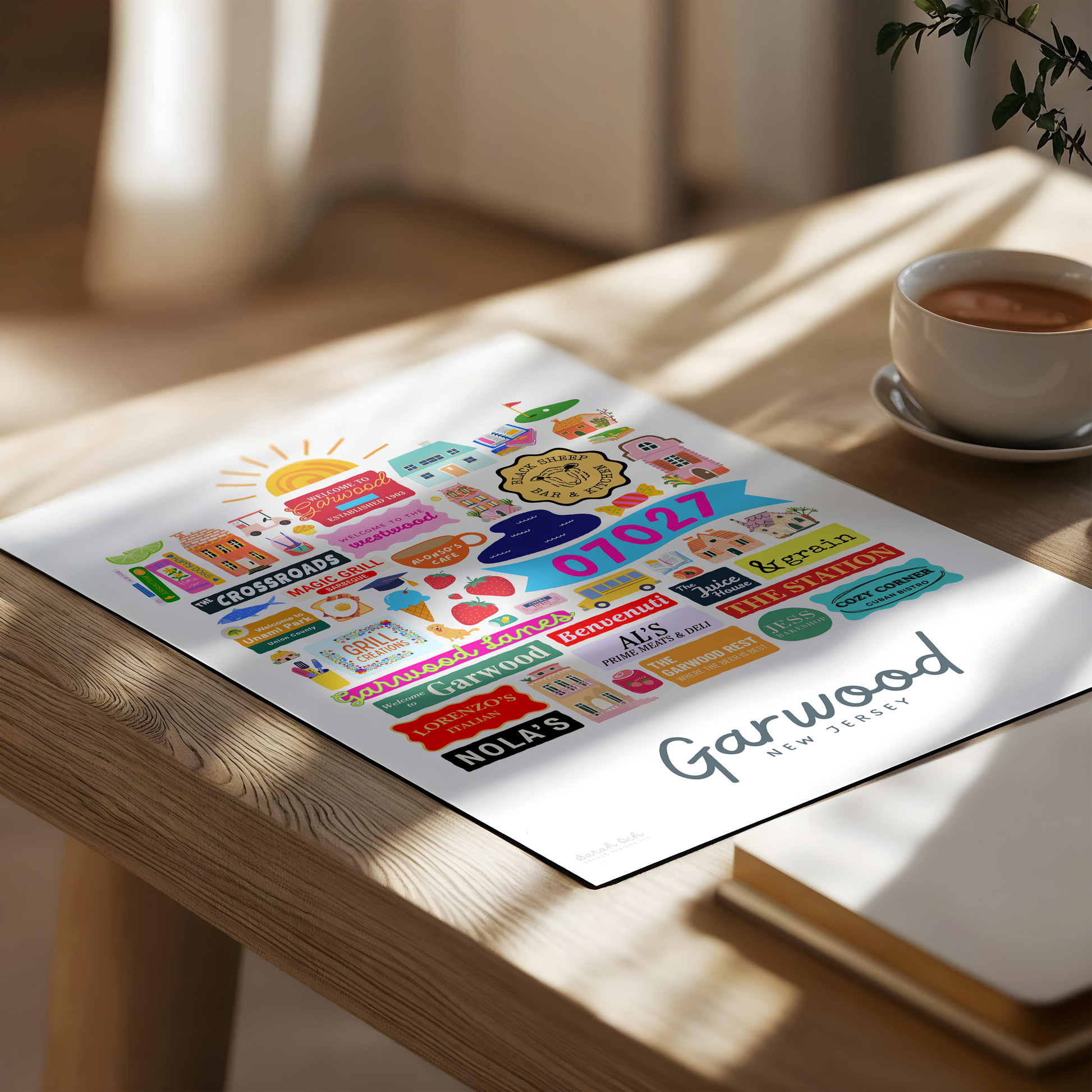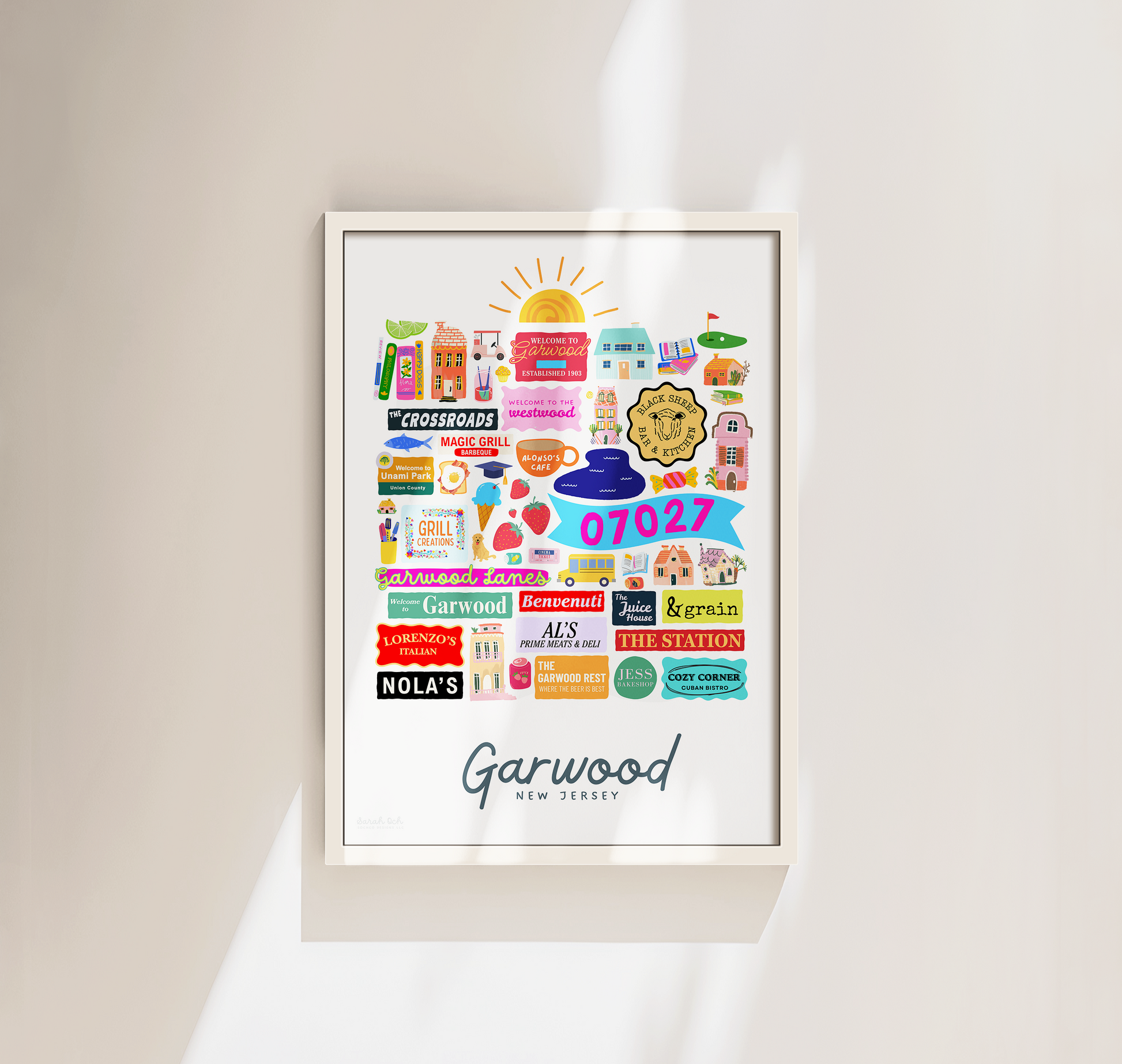 Colorful, custom-designed print featuring local attractions. All prints are printed on glossy photo paper. All framed prints come in a lightweight, white frame.