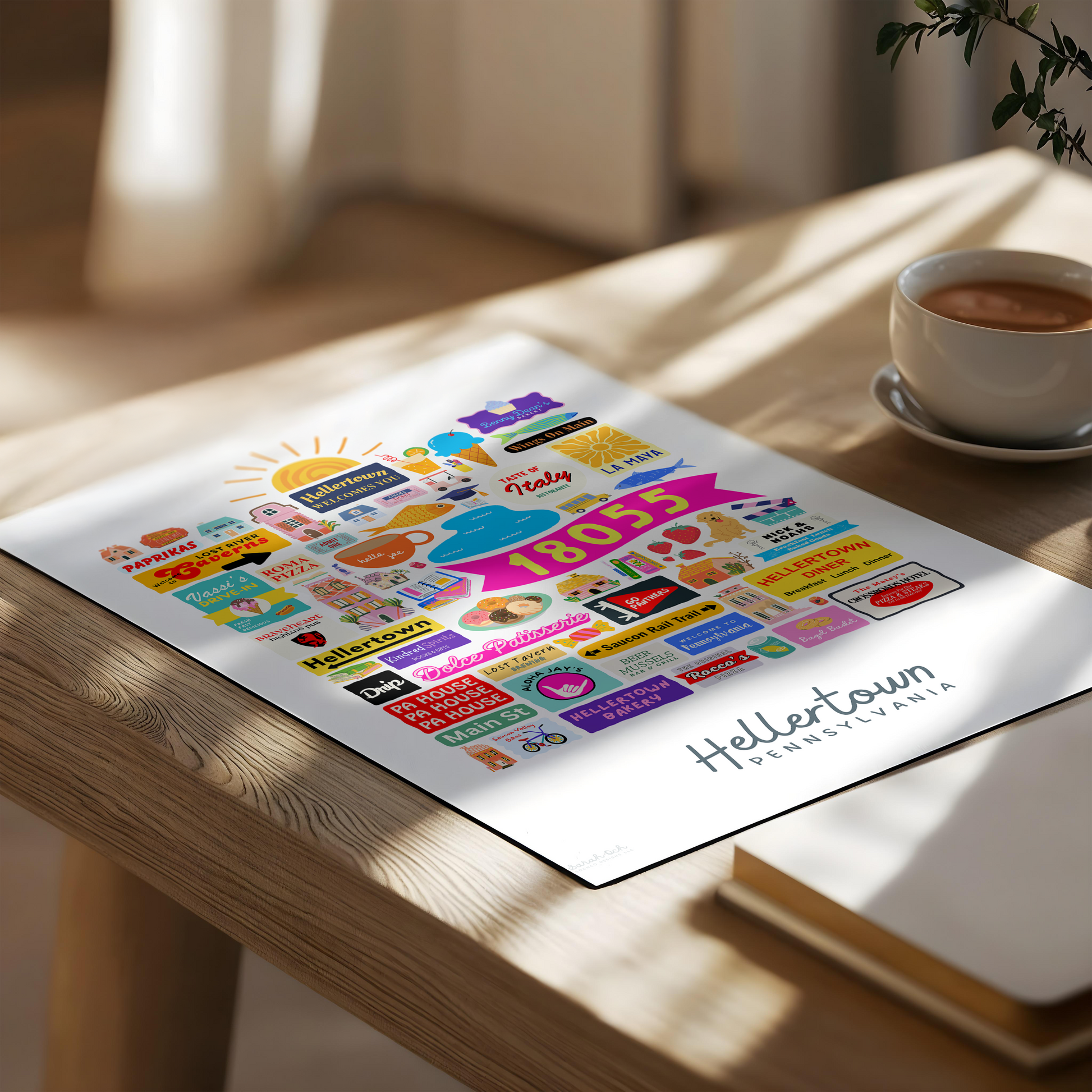 Colorful, custom-designed print featuring local attractions. All prints are printed on glossy photo paper. All framed prints come in a lightweight, white frame.