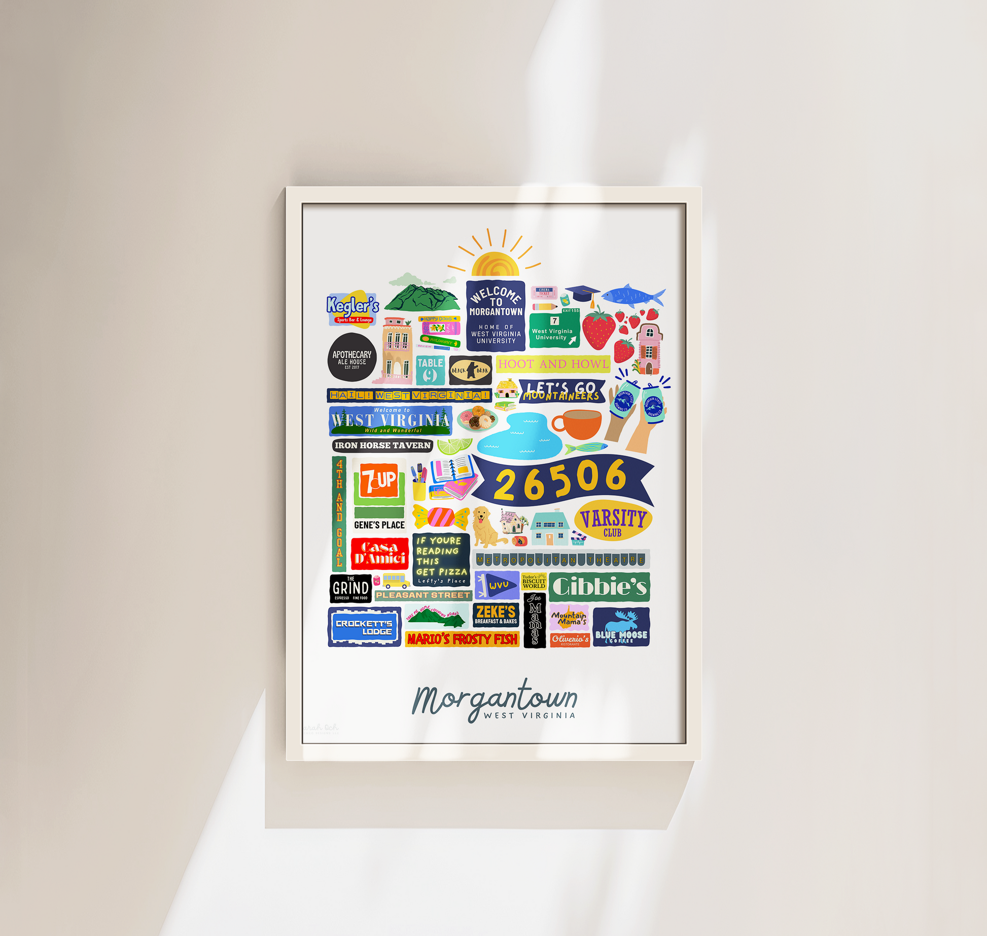 Colorful, custom-designed print featuring local attractions. All prints are printed on glossy photo paper. All framed prints come in a lightweight, white frame.