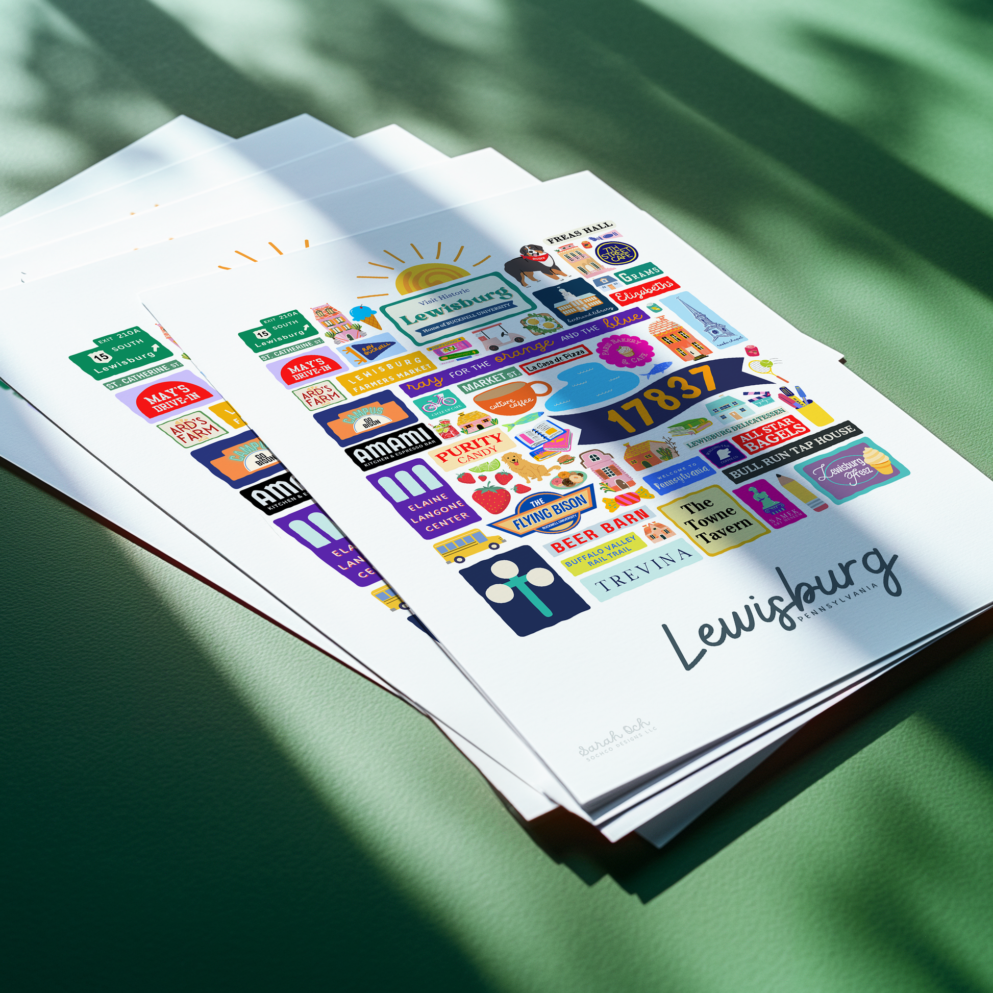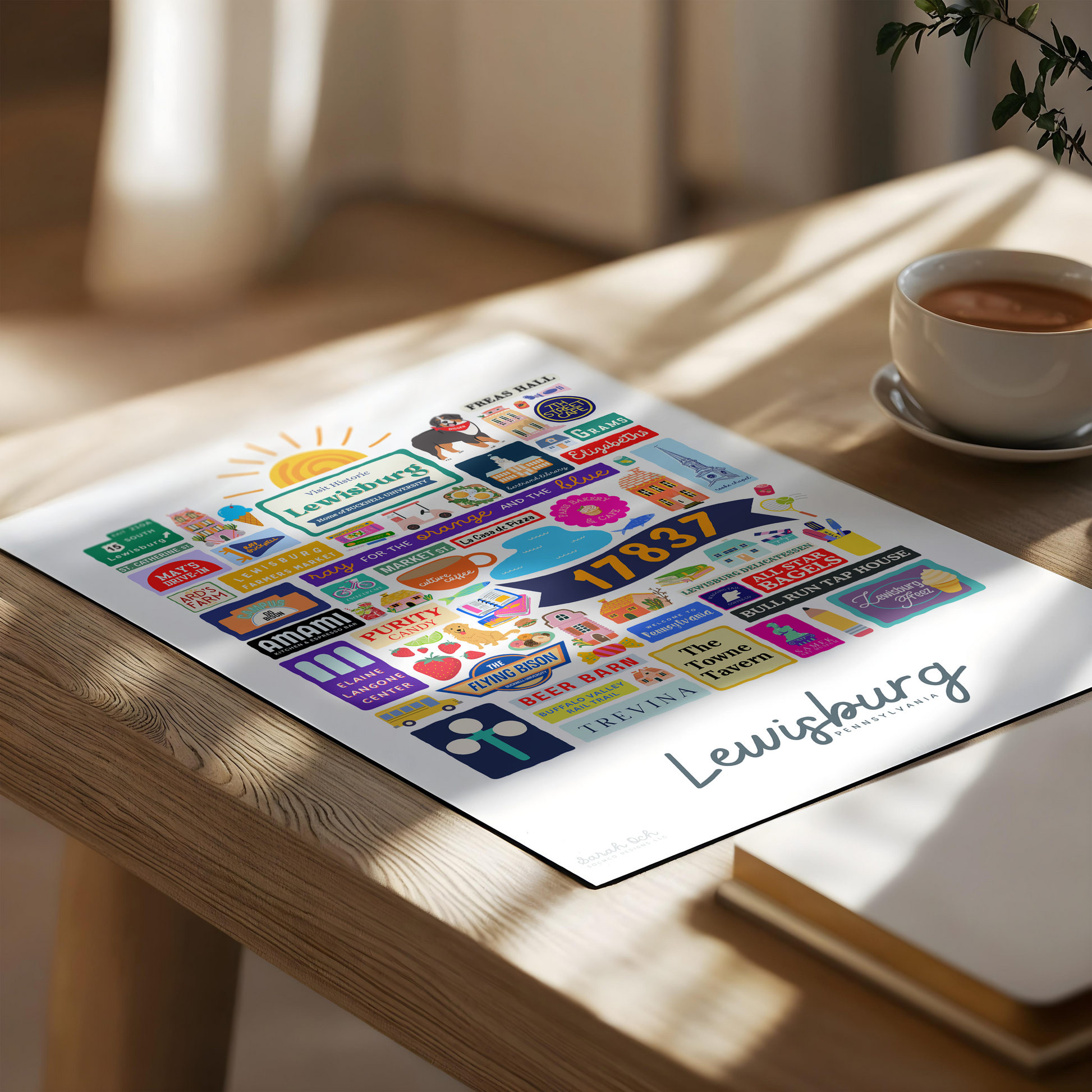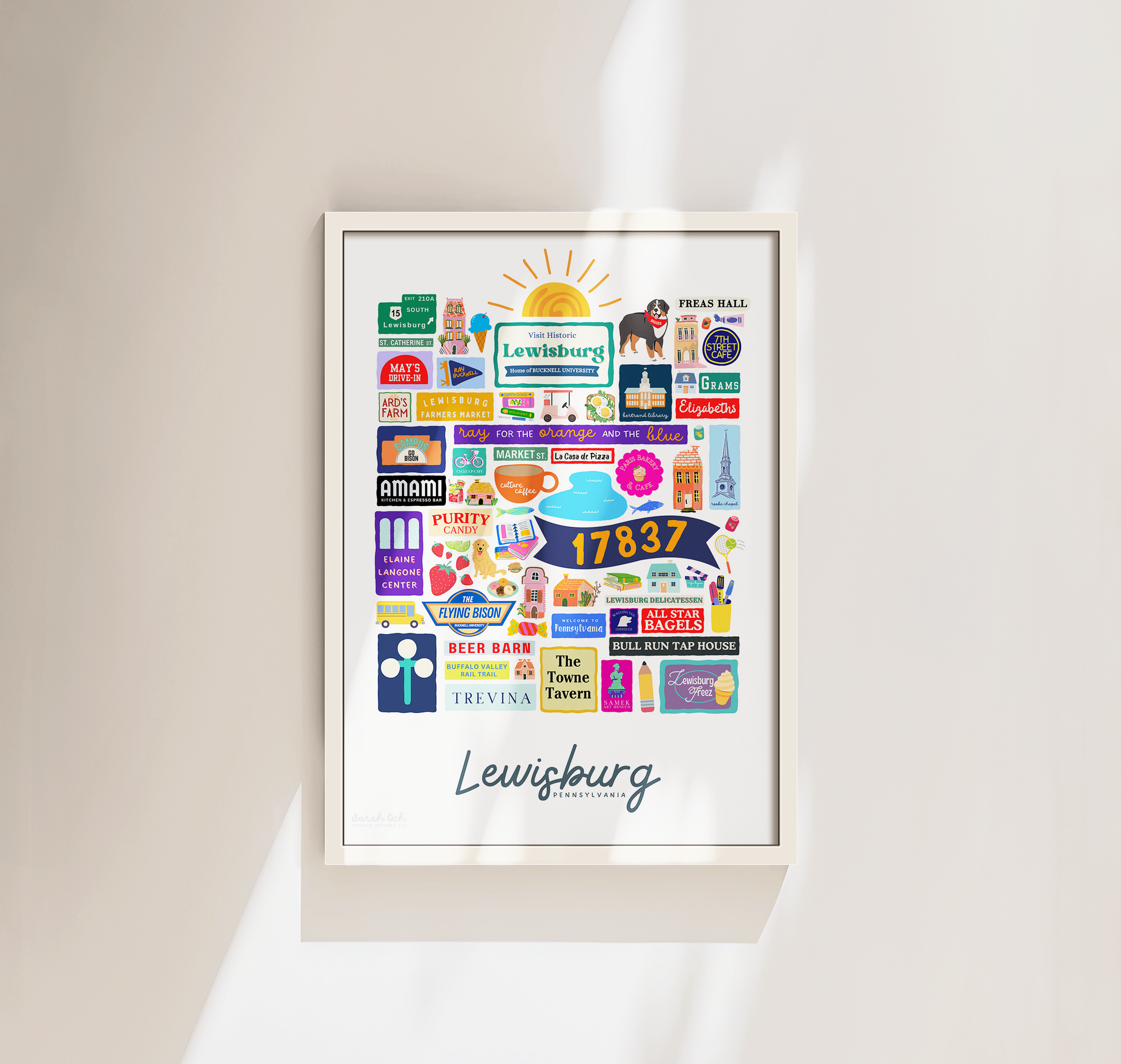 Colorful, custom-designed print featuring local attractions. All prints are printed on glossy photo paper. All framed prints come in a lightweight, white frame.