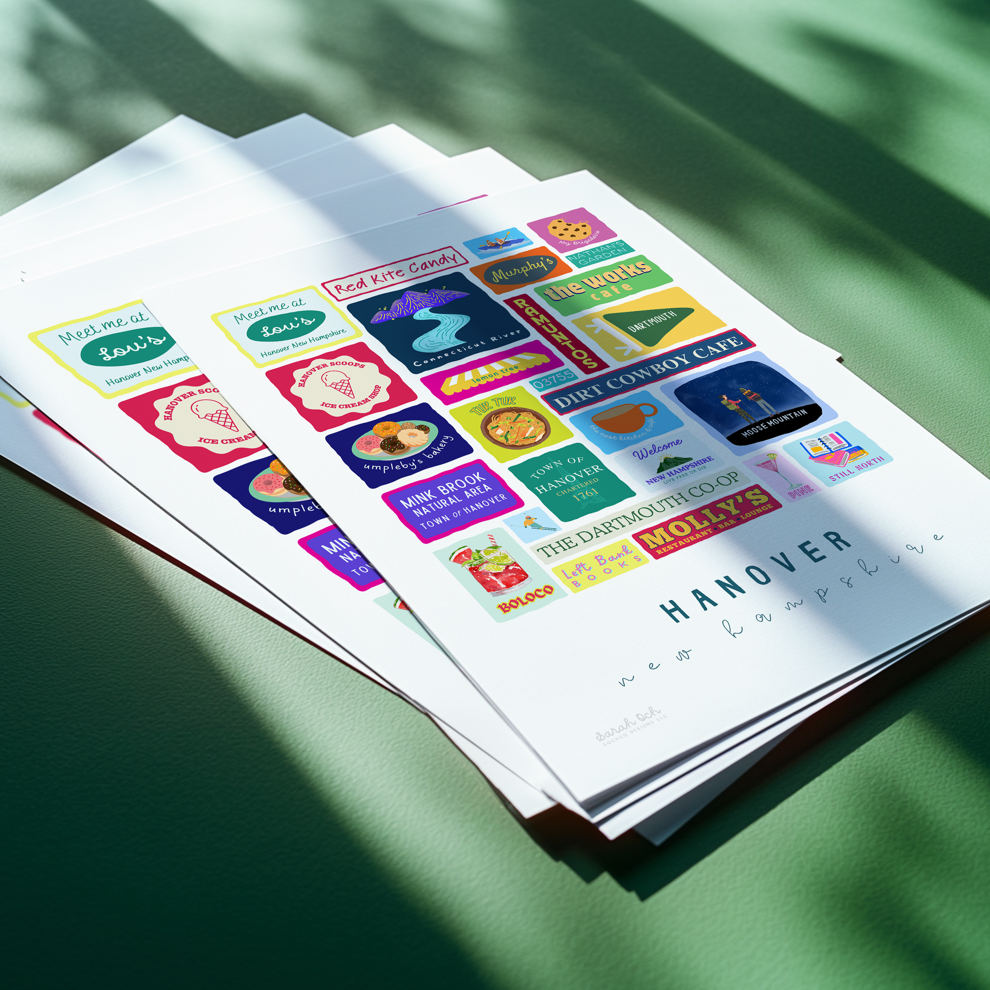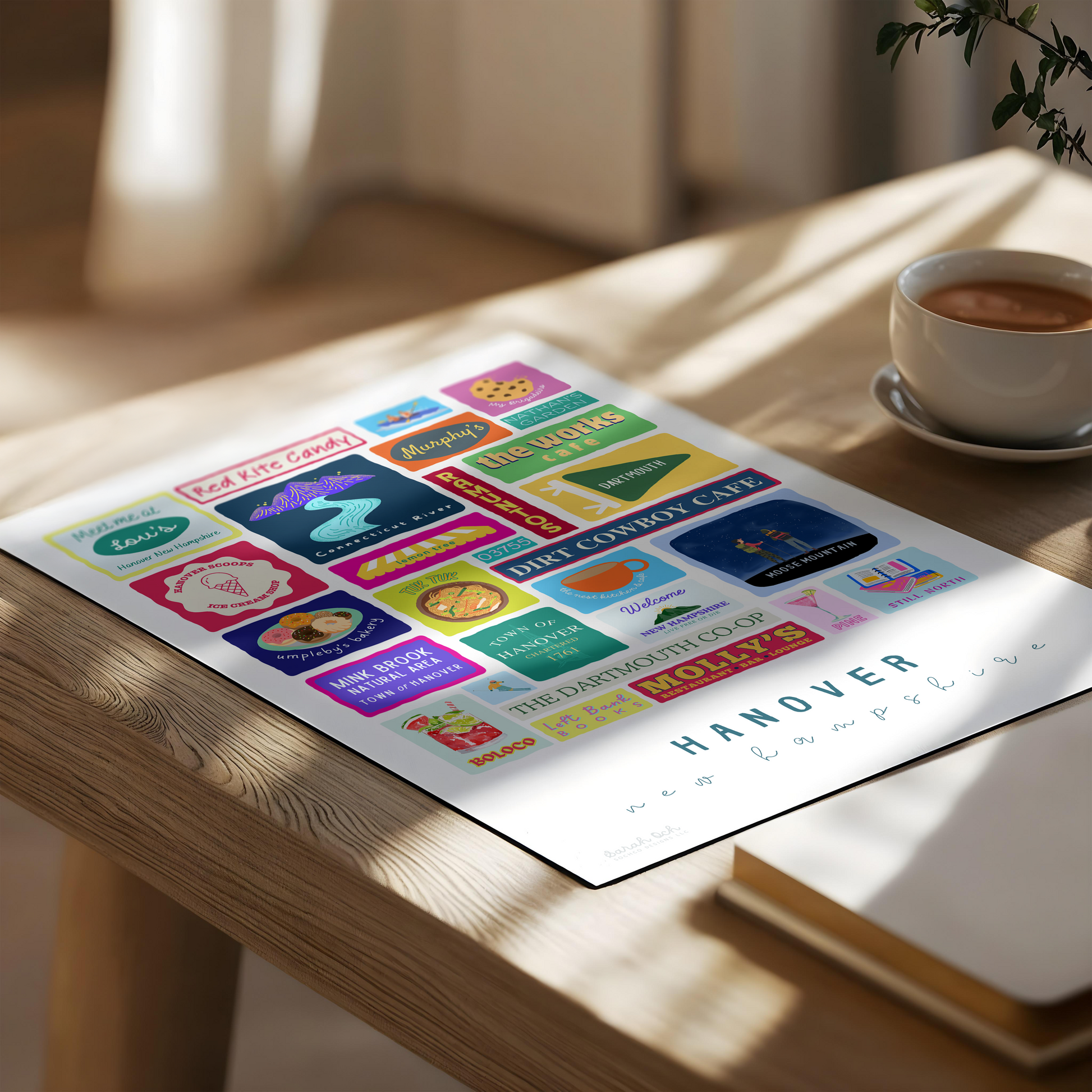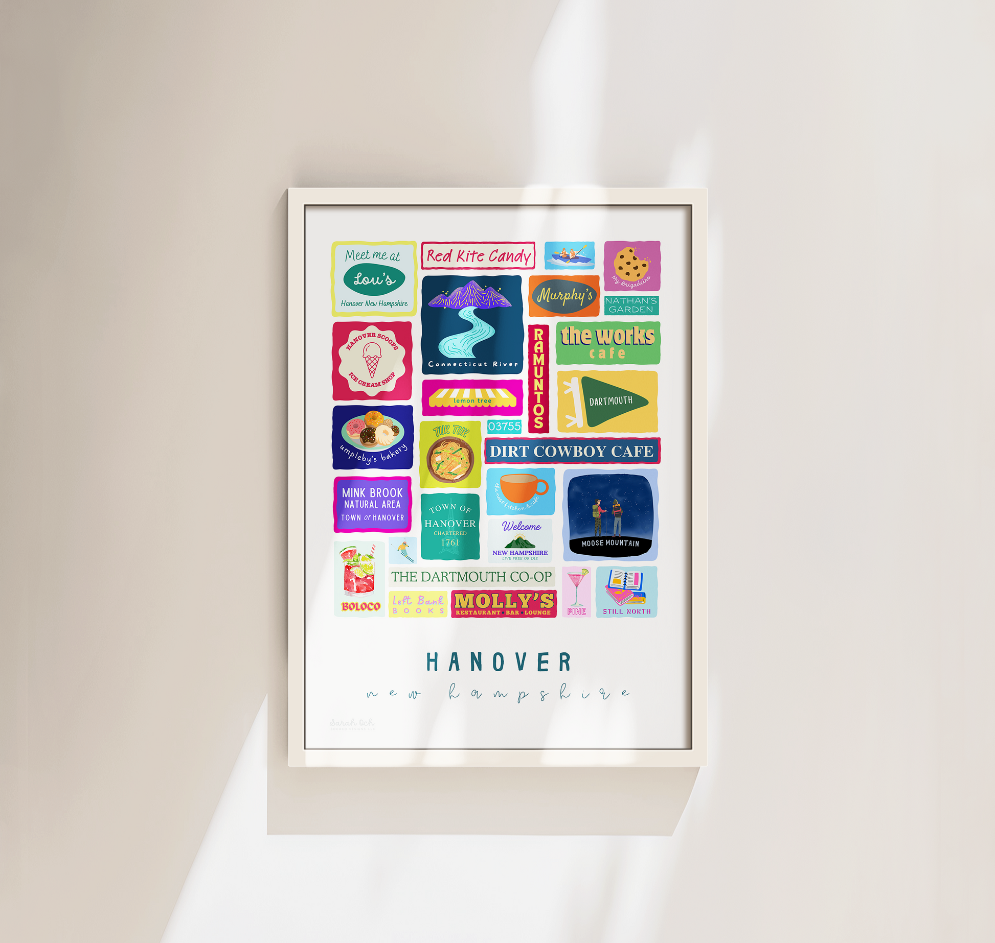 Colorful, custom-designed print featuring local attractions. All prints are printed on glossy photo paper. All framed prints come in a lightweight, white frame.