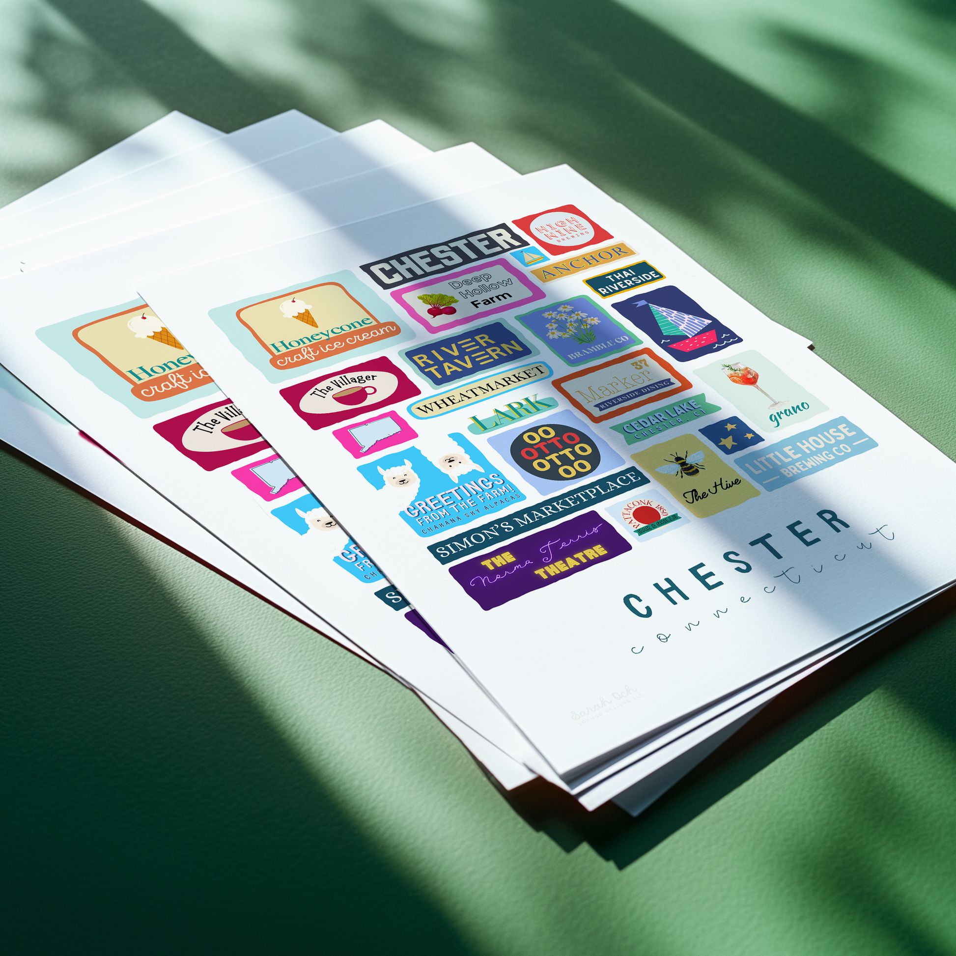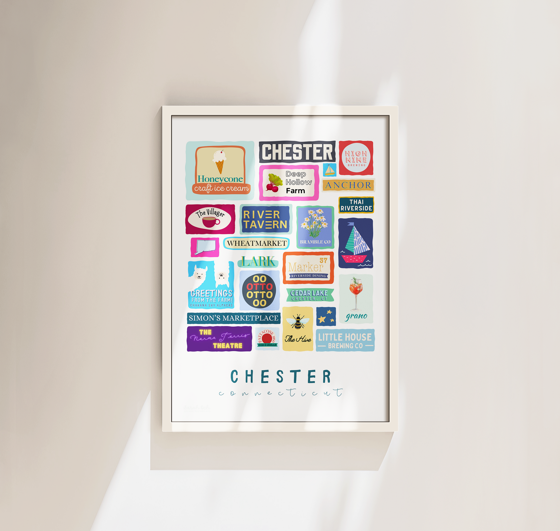 Colorful, custom-designed print featuring local attractions. All prints are printed on glossy photo paper. All framed prints come in a lightweight, white frame.