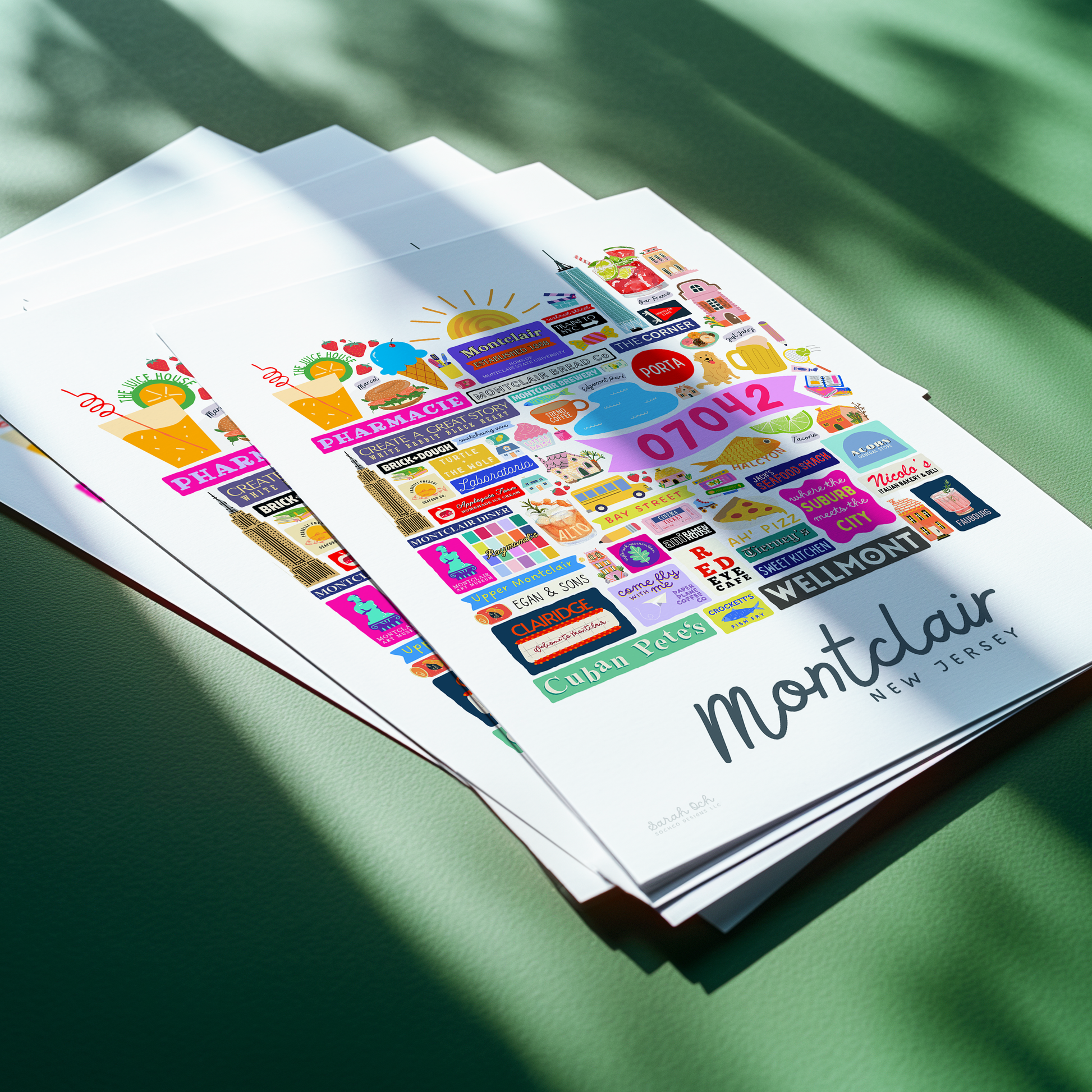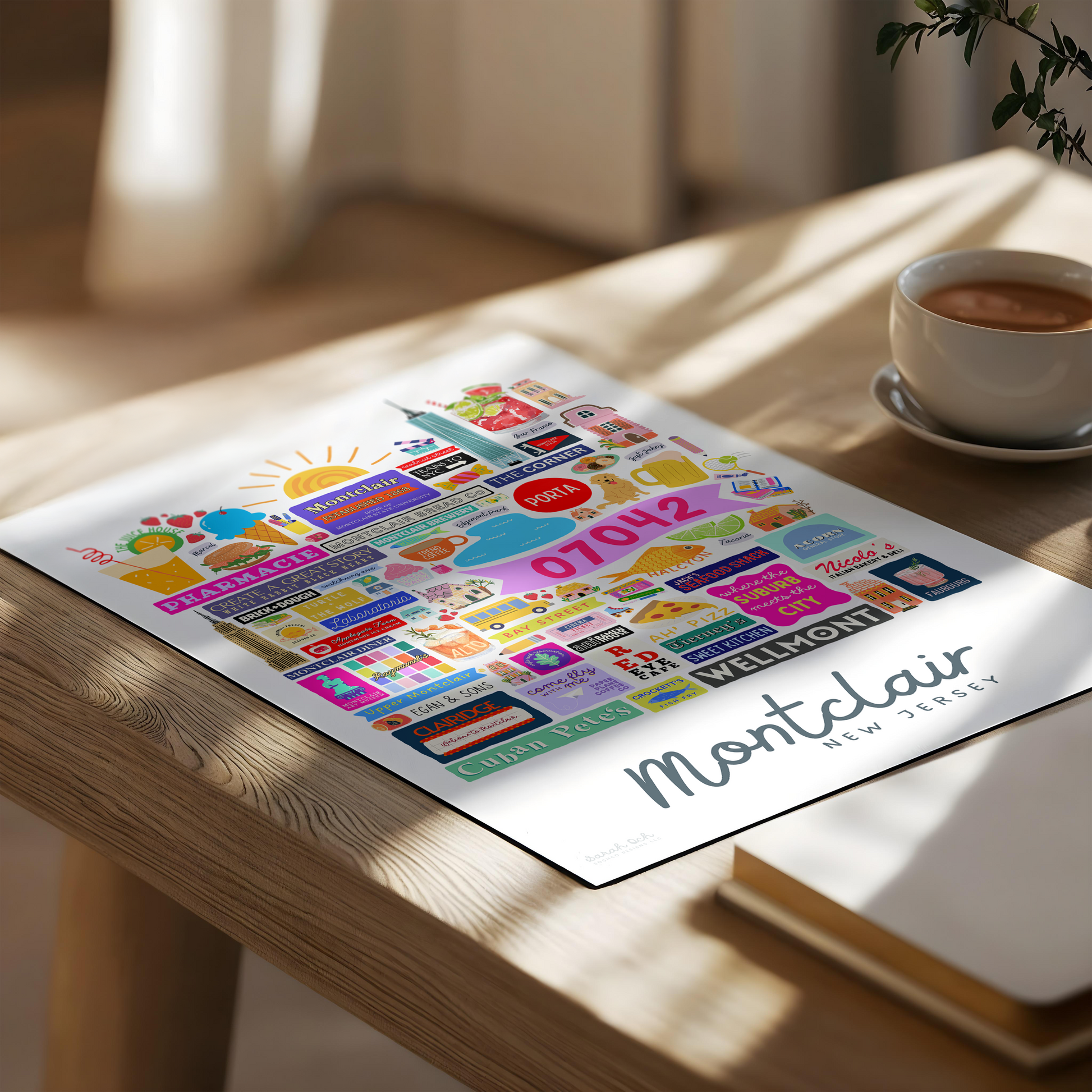 Colorful, custom-designed print featuring local attractions. All prints are printed on glossy photo paper. All framed prints come in a lightweight, white frame.