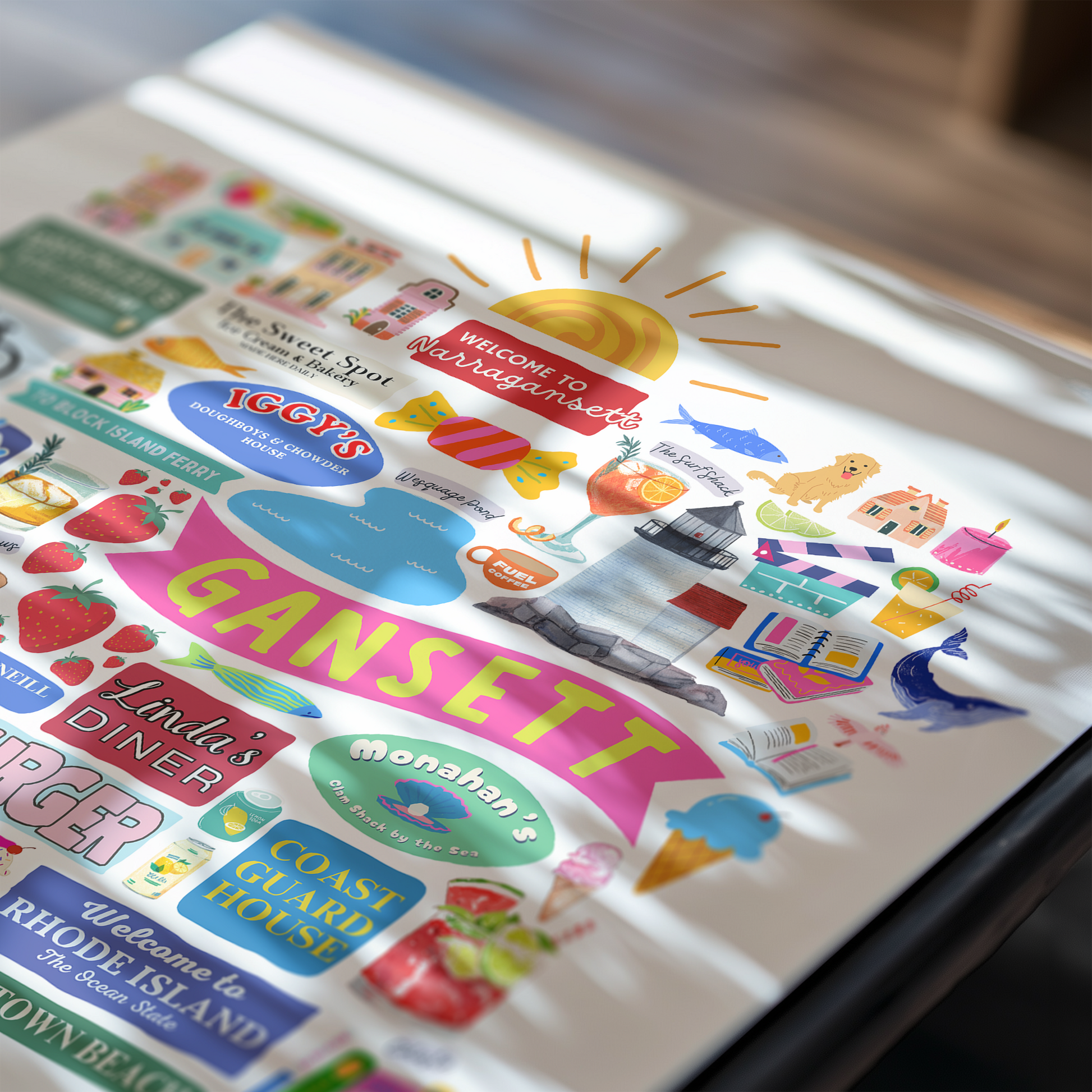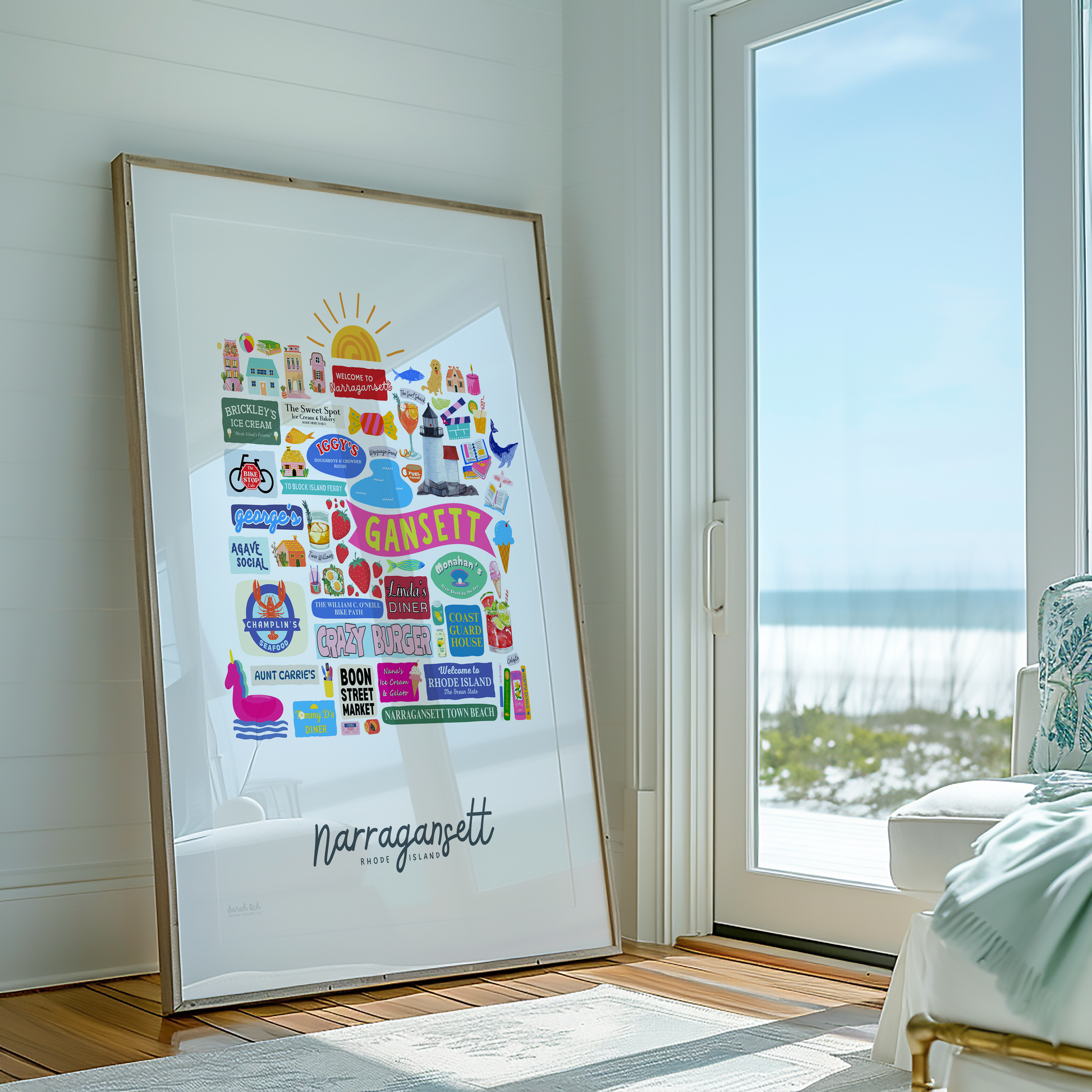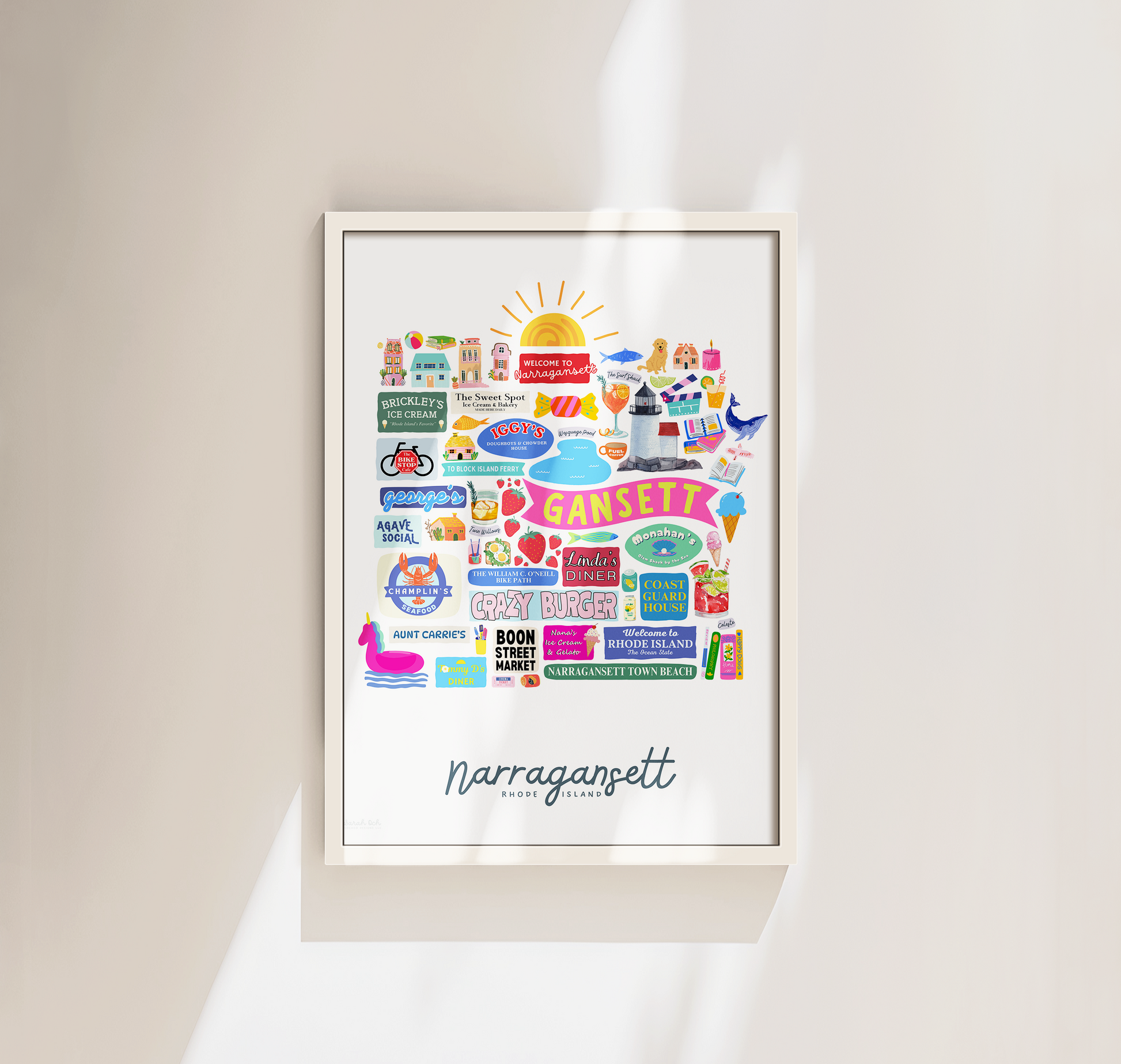 Colorful, custom-designed print featuring local attractions. All prints are printed on glossy photo paper. All framed prints come in a lightweight, white frame.