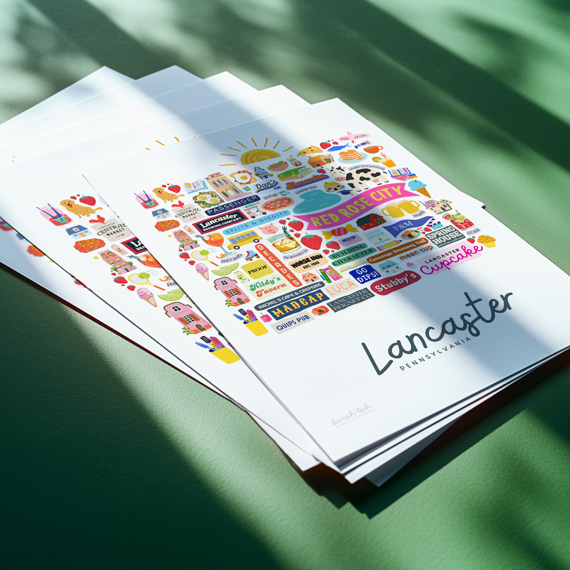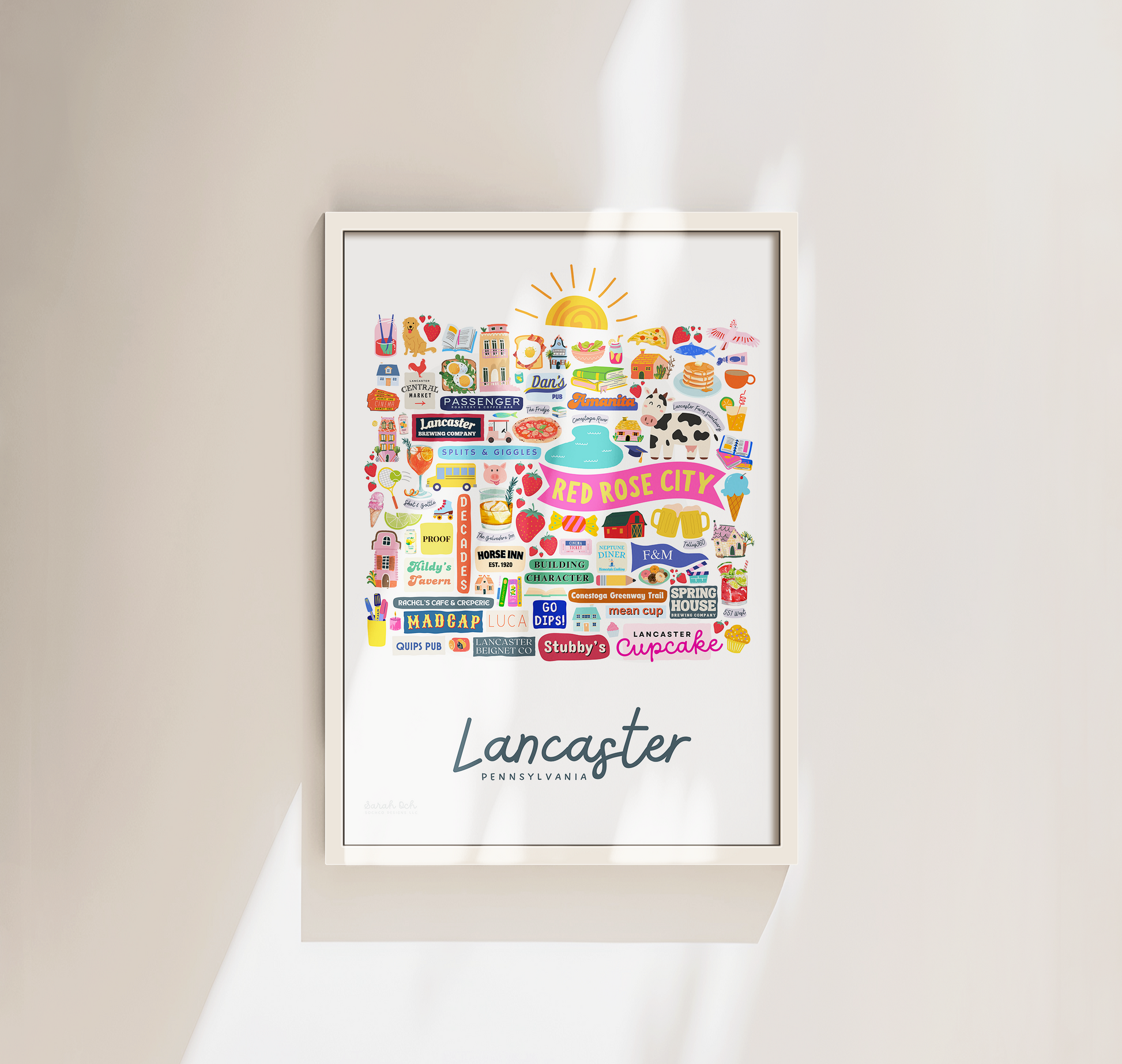 Colorful, custom-designed print featuring local attractions. All prints are printed on glossy photo paper. All framed prints come in a lightweight, white frame.