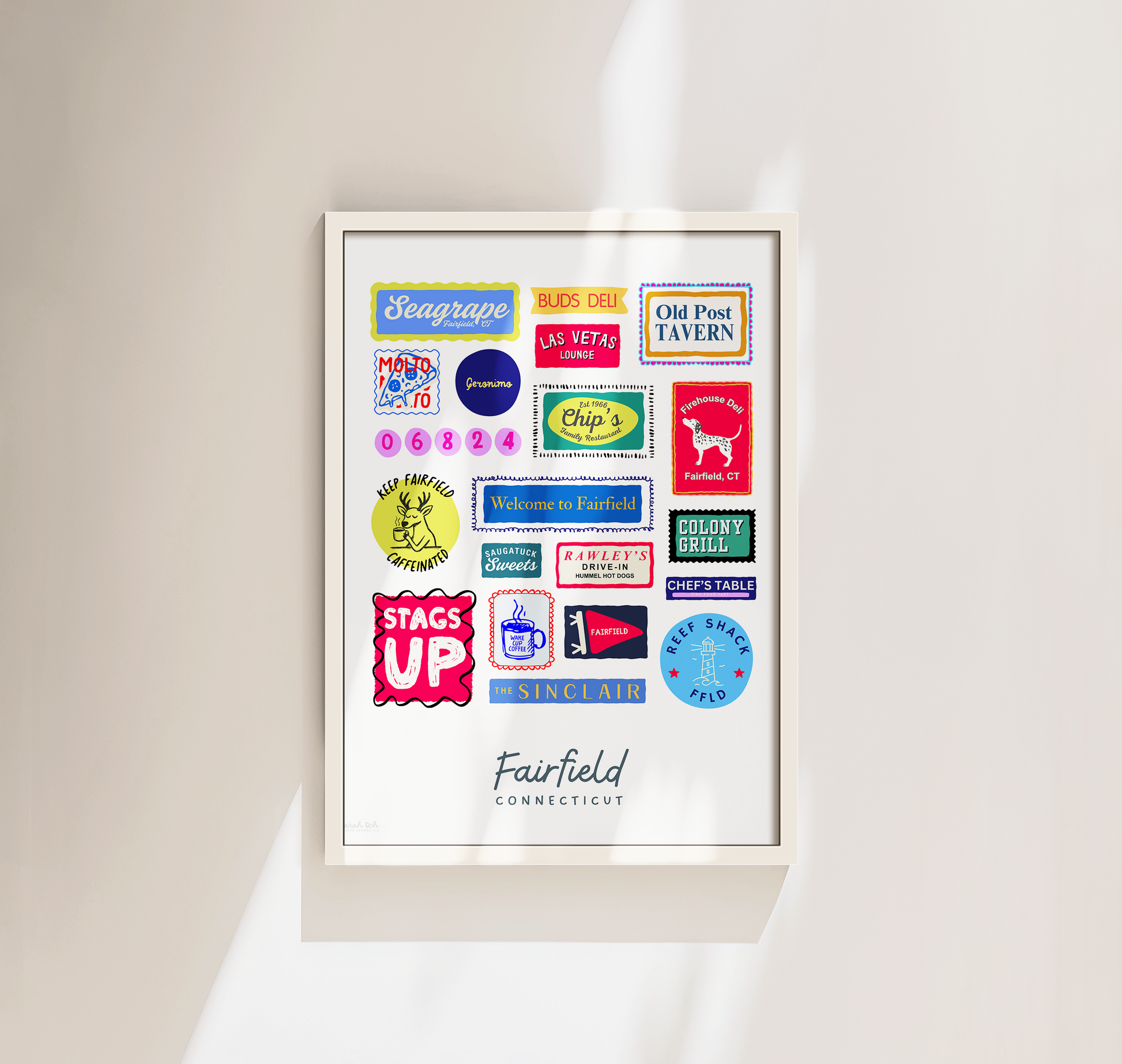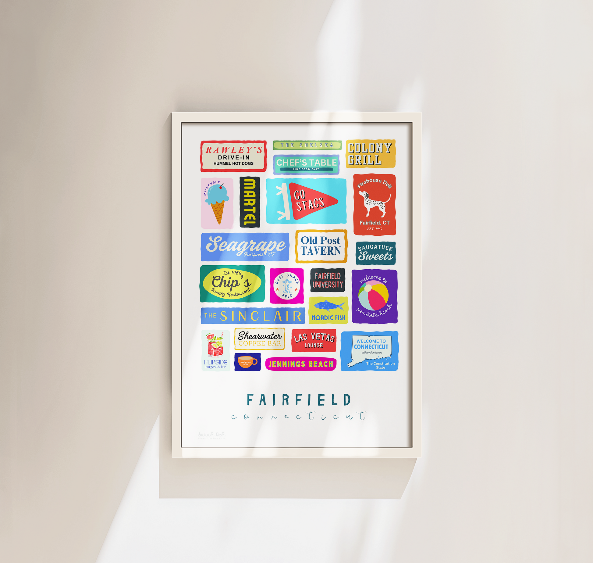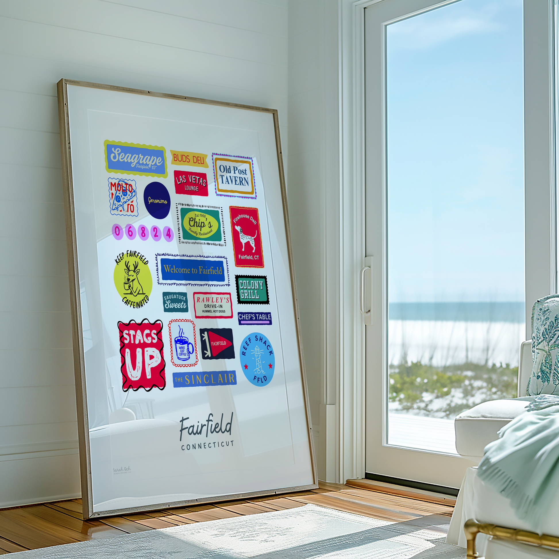 Colorful, custom-designed print featuring local attractions. All prints are printed on glossy photo paper. All framed prints come in a lightweight, white frame.