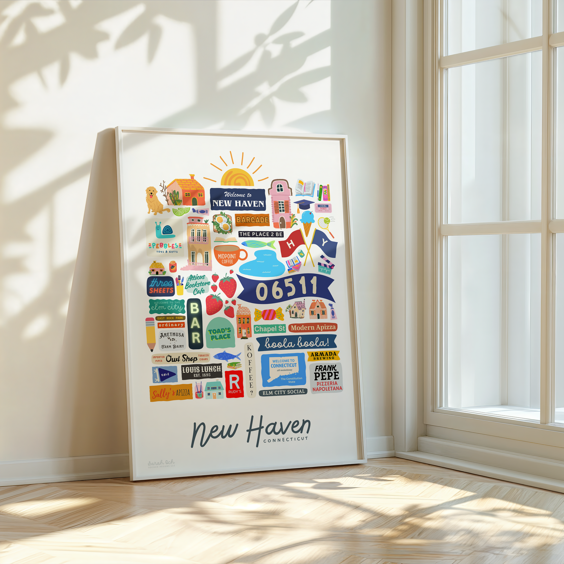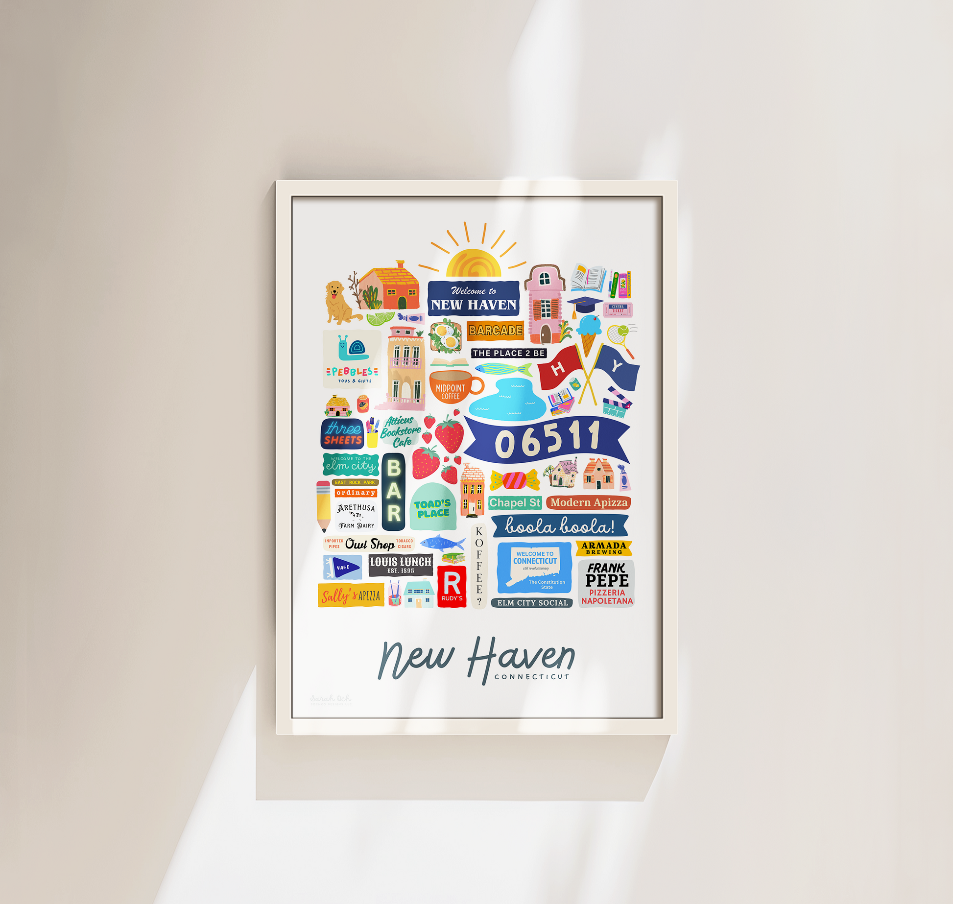 Colorful, custom-designed print featuring local attractions. All prints are printed on glossy photo paper. All framed prints come in a lightweight, white frame.