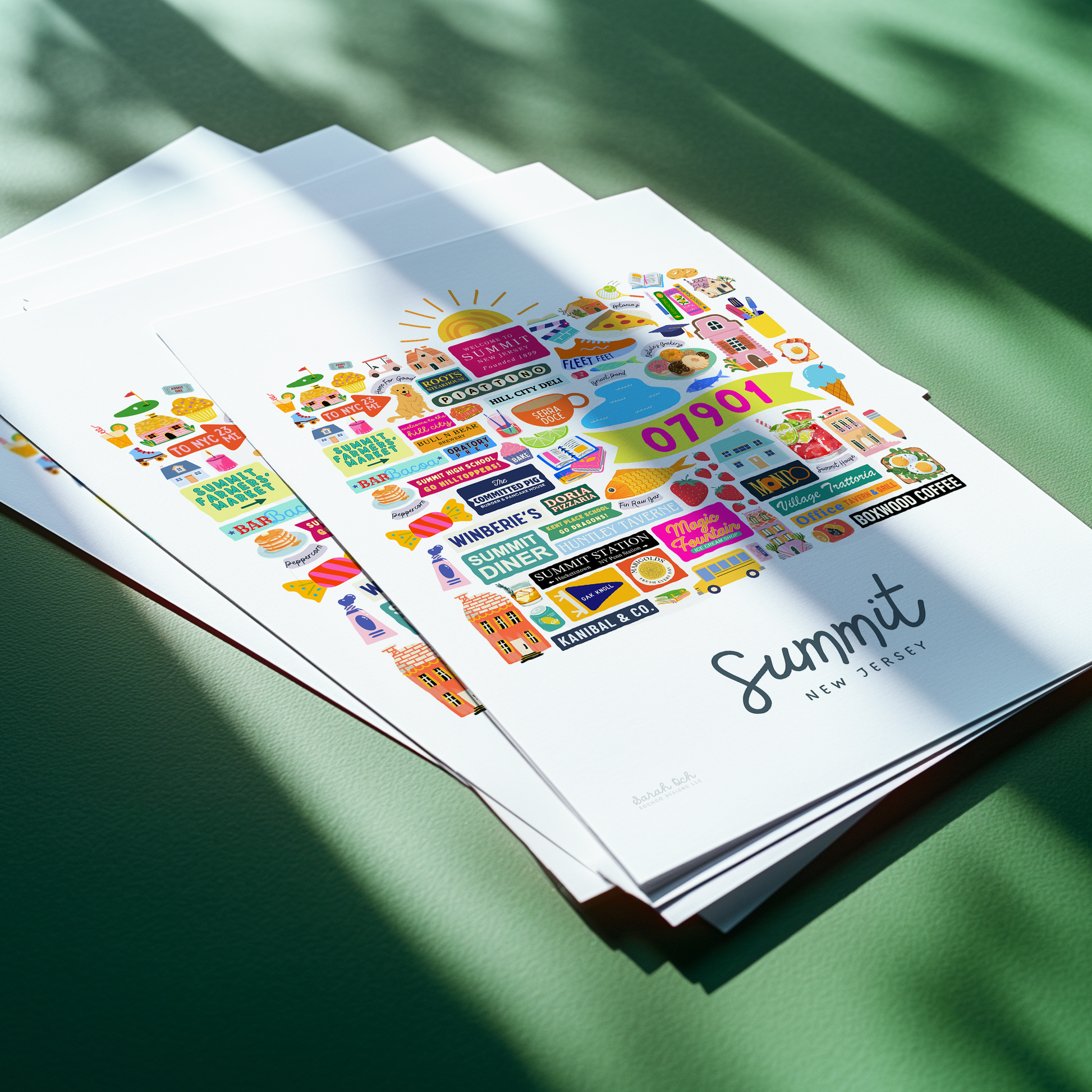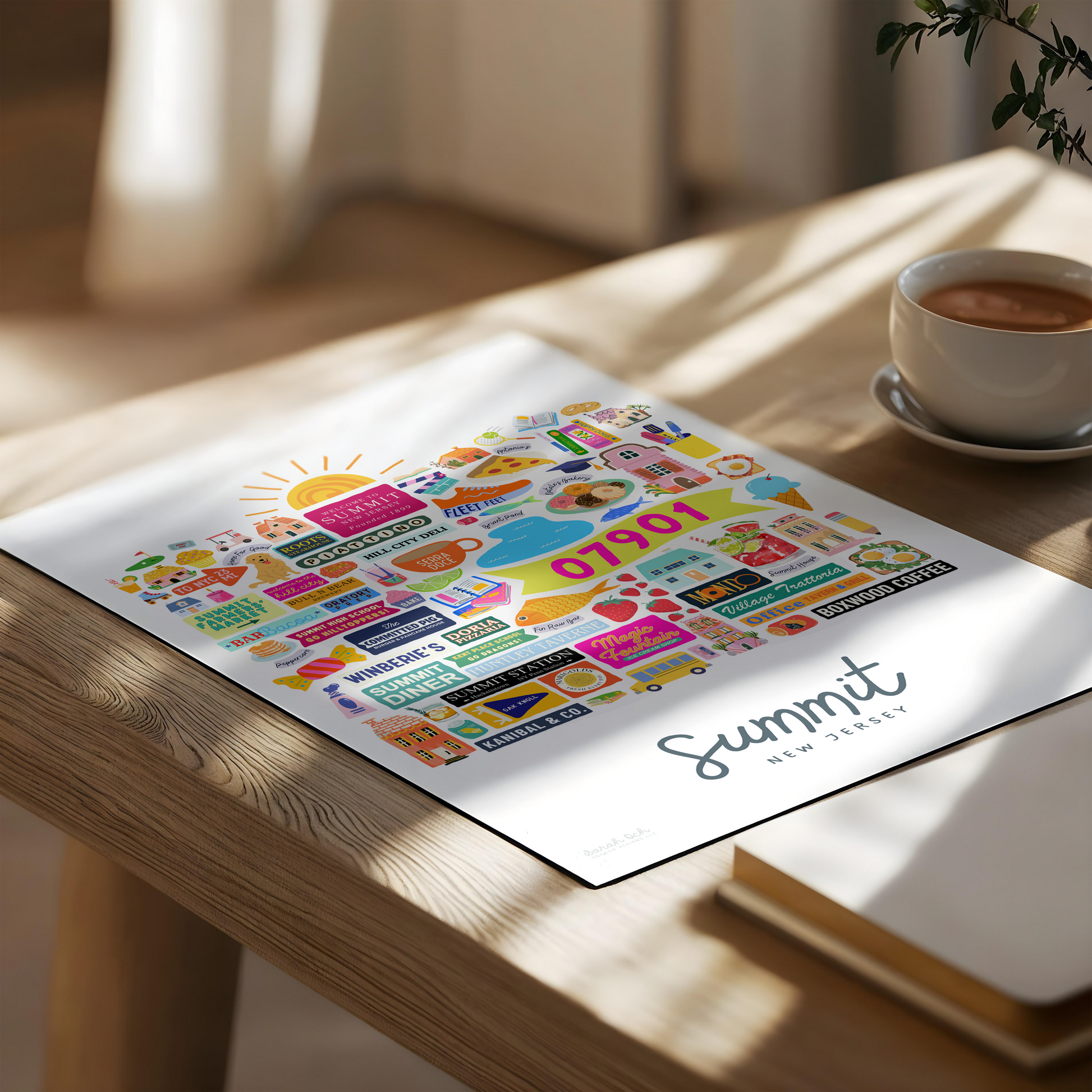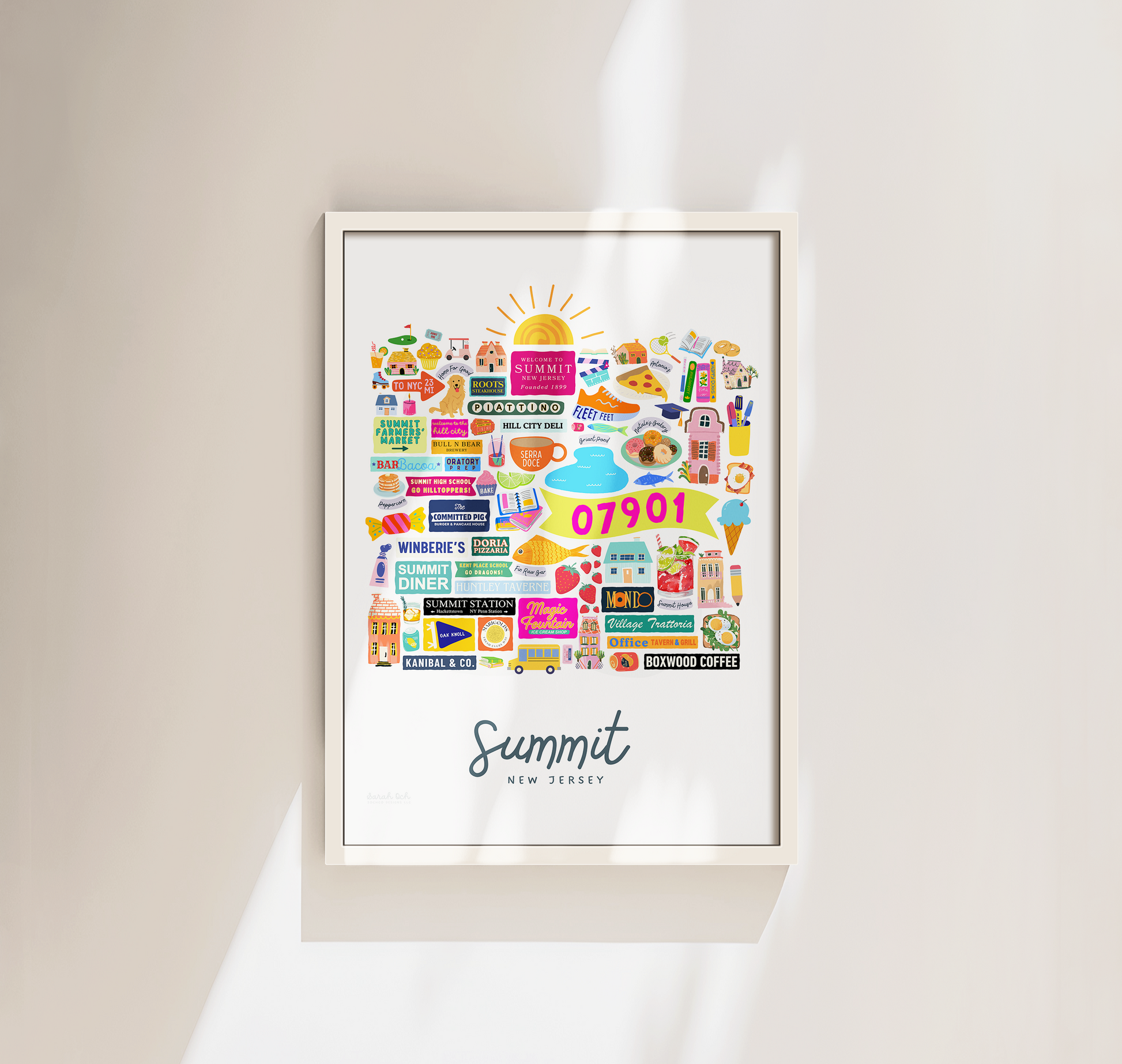 Colorful, custom-designed print featuring local attractions. All prints are printed on glossy photo paper. All framed prints come in a lightweight, white frame.