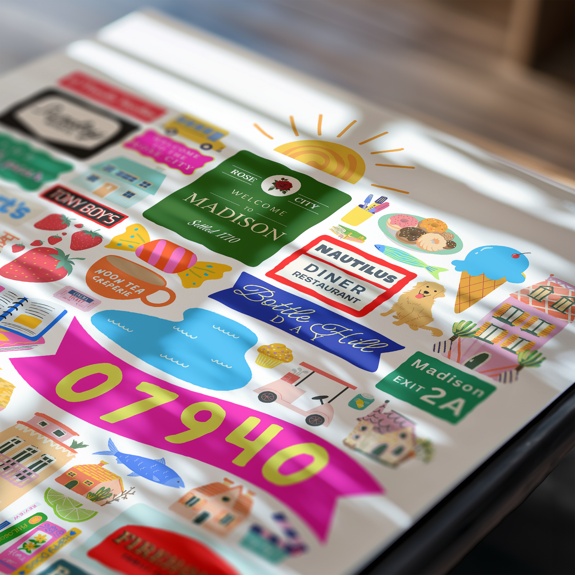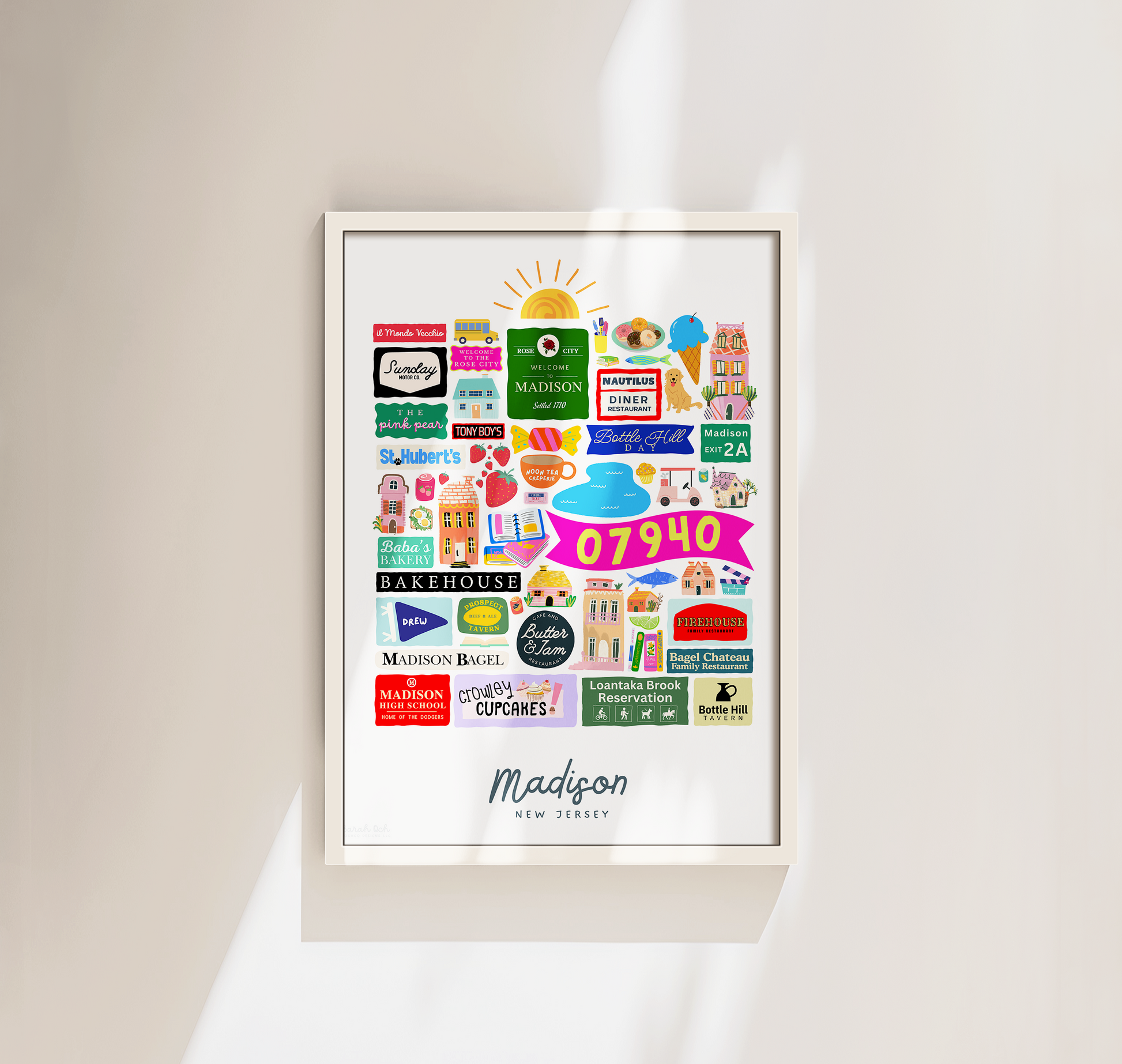 Colorful, custom-designed print featuring local attractions. All prints are printed on glossy photo paper. All framed prints come in a lightweight, white frame.