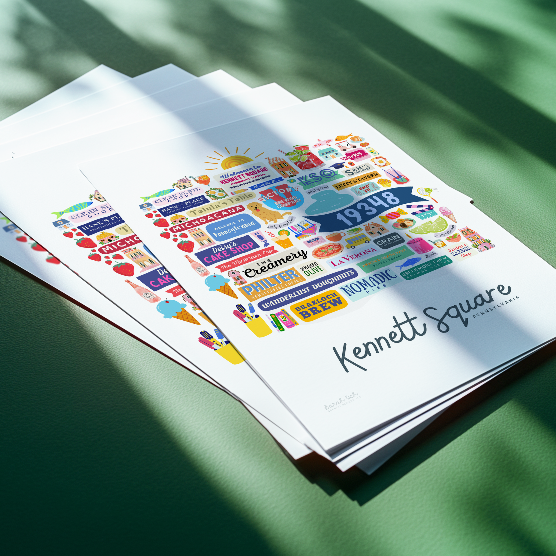 Colorful, custom-designed print featuring local attractions. All prints are printed on glossy photo paper. All framed prints come in a lightweight, white frame.