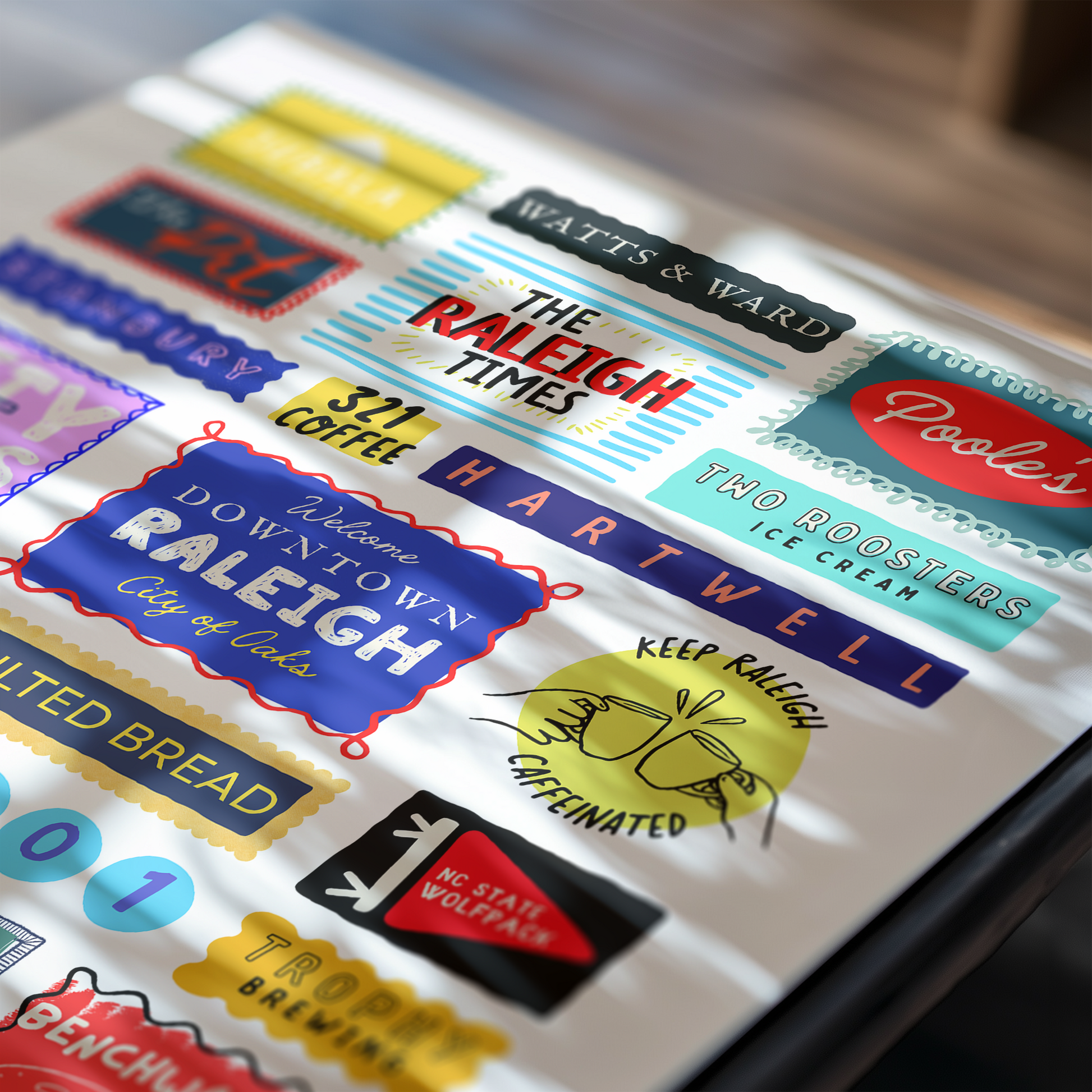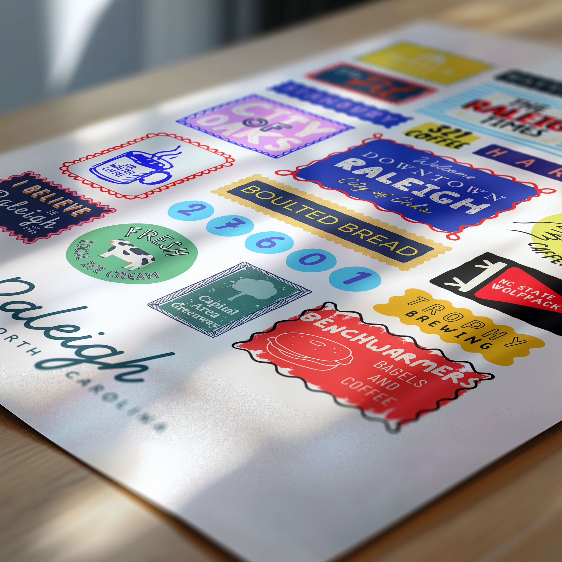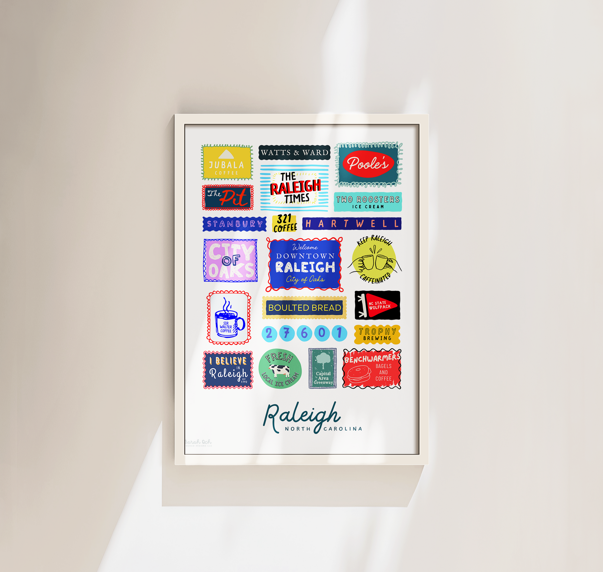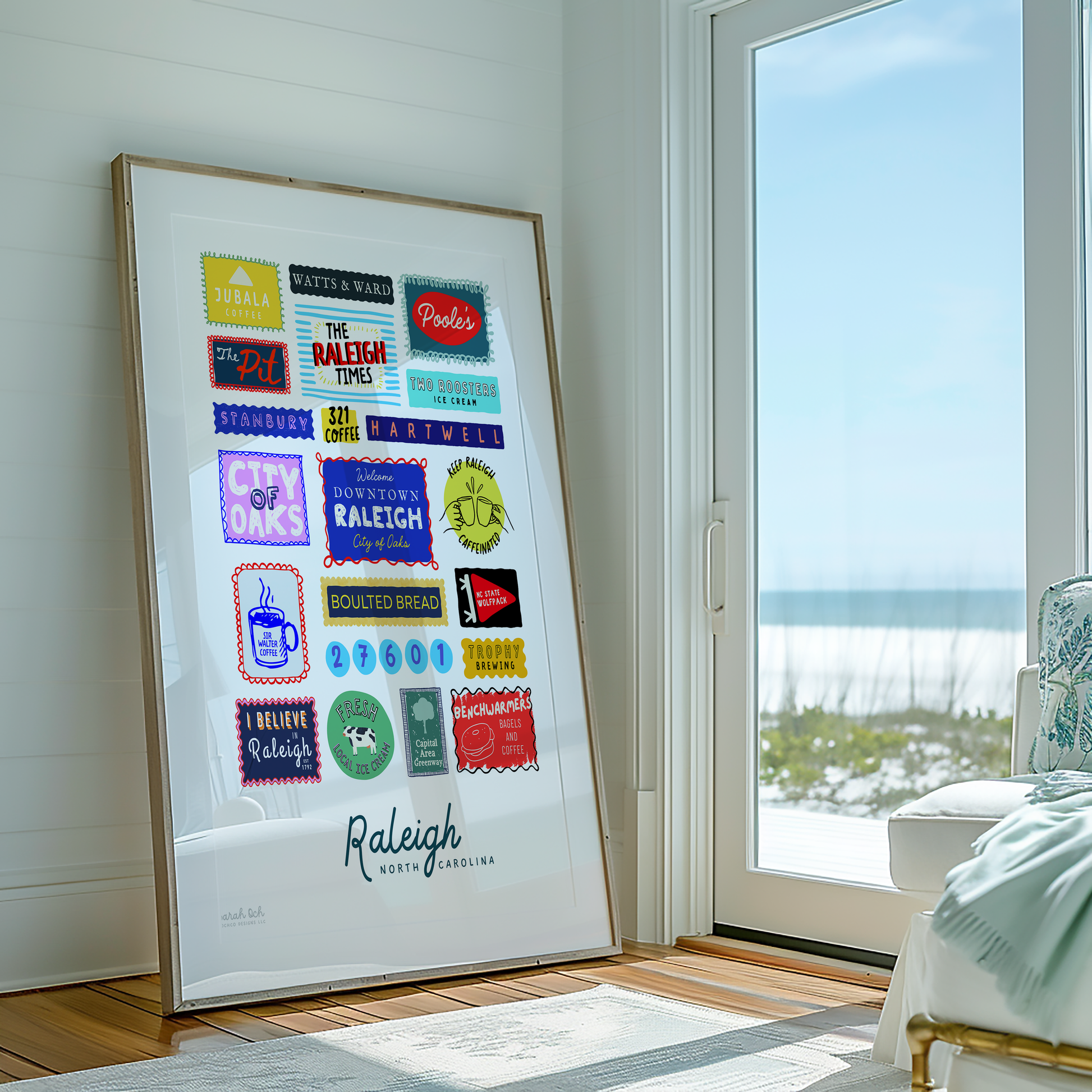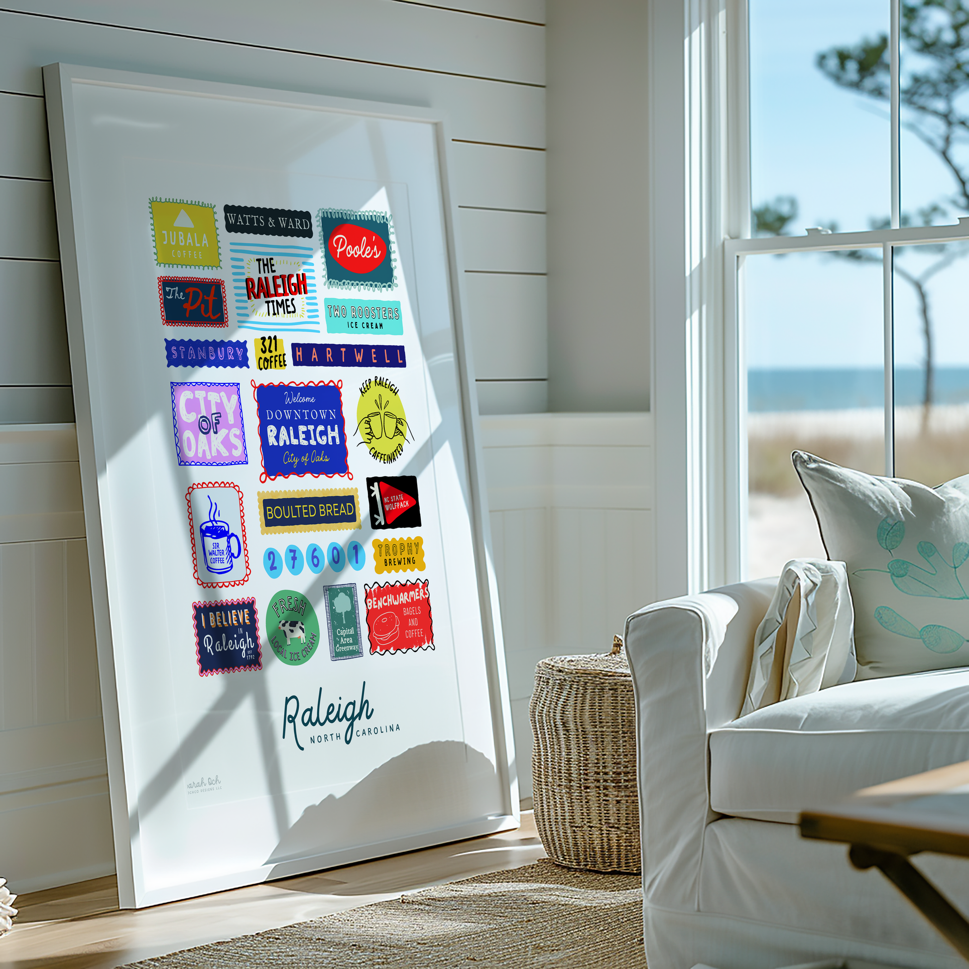 Colorful, custom-designed print featuring local attractions. All prints are printed on glossy photo paper. All framed prints come in a lightweight, white frame.