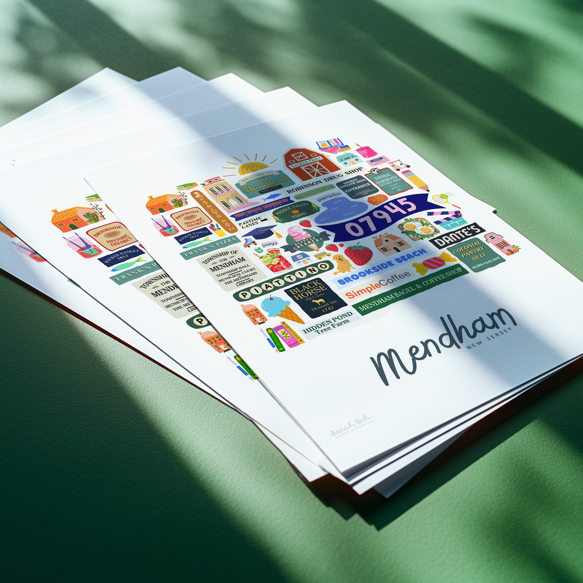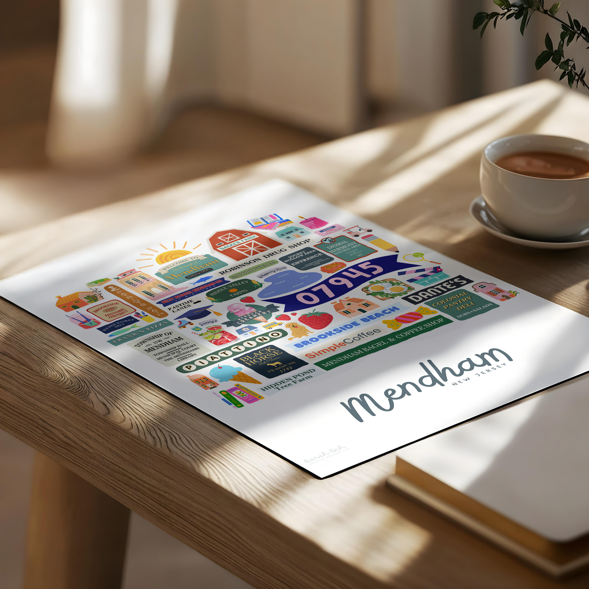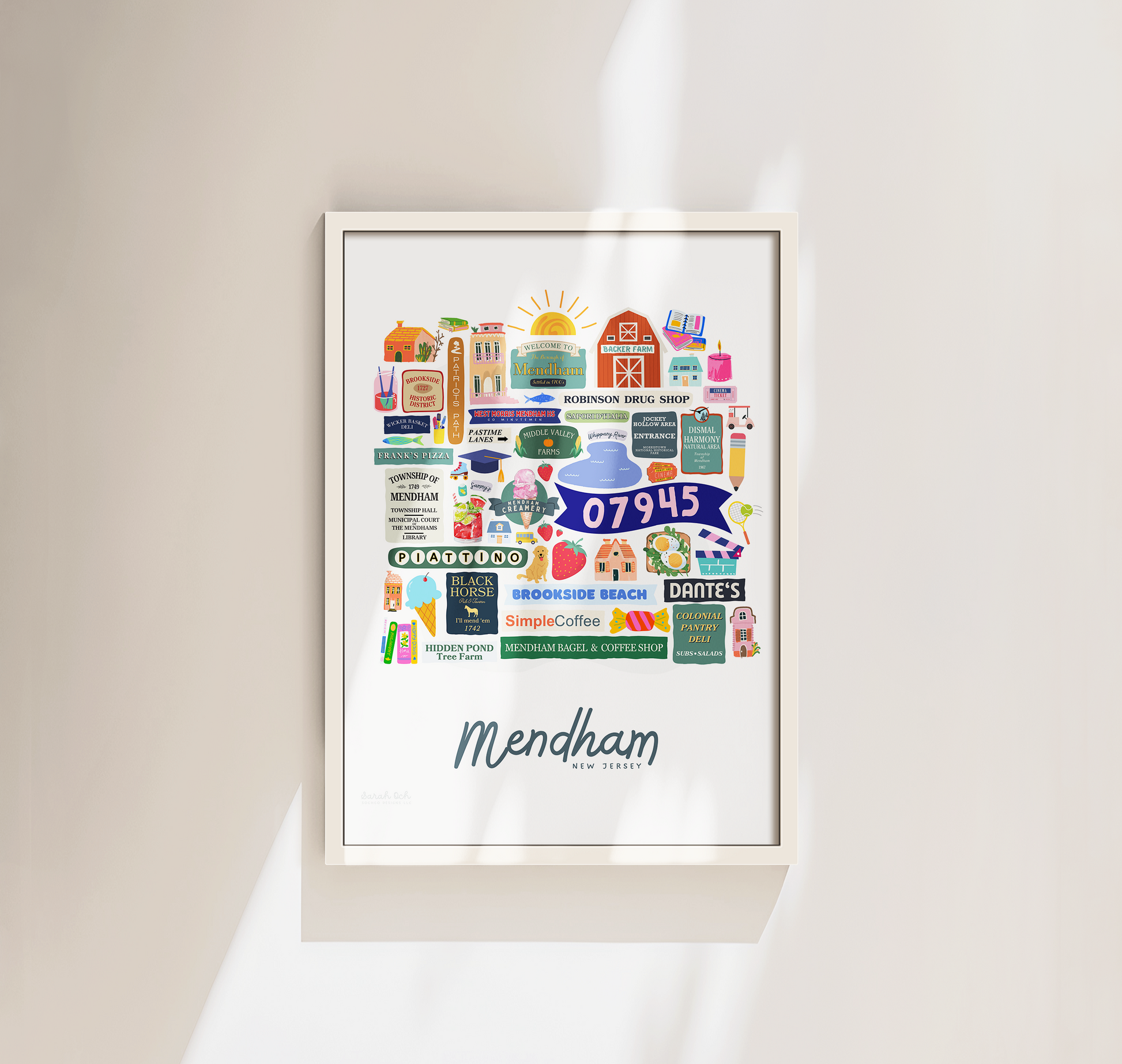 Colorful, custom-designed print featuring local attractions. All prints are printed on glossy photo paper. All framed prints come in a lightweight, white frame.