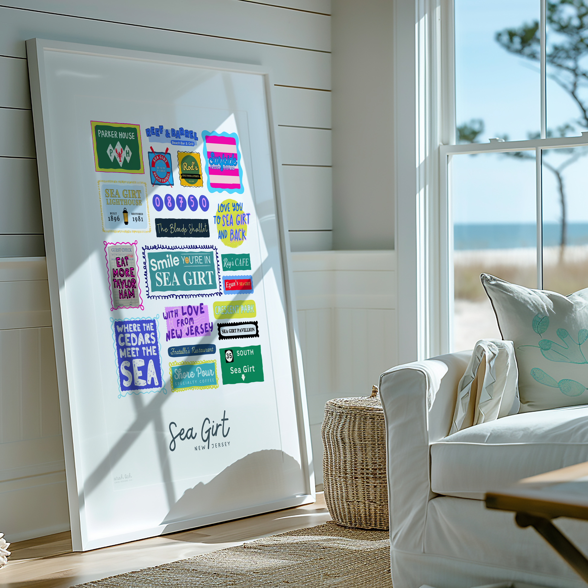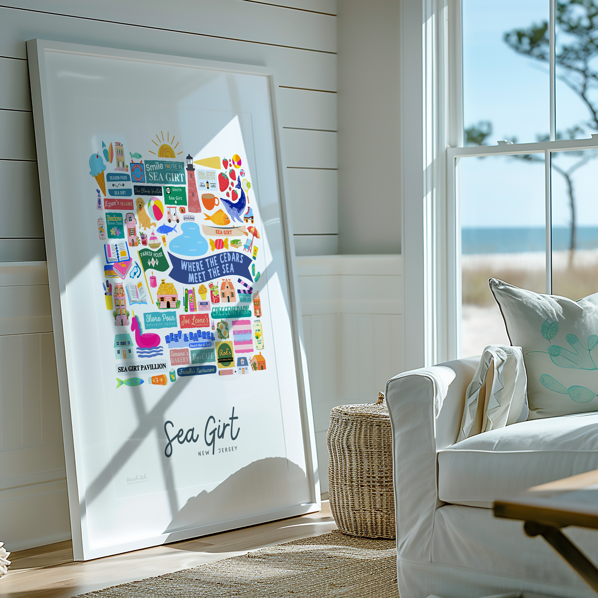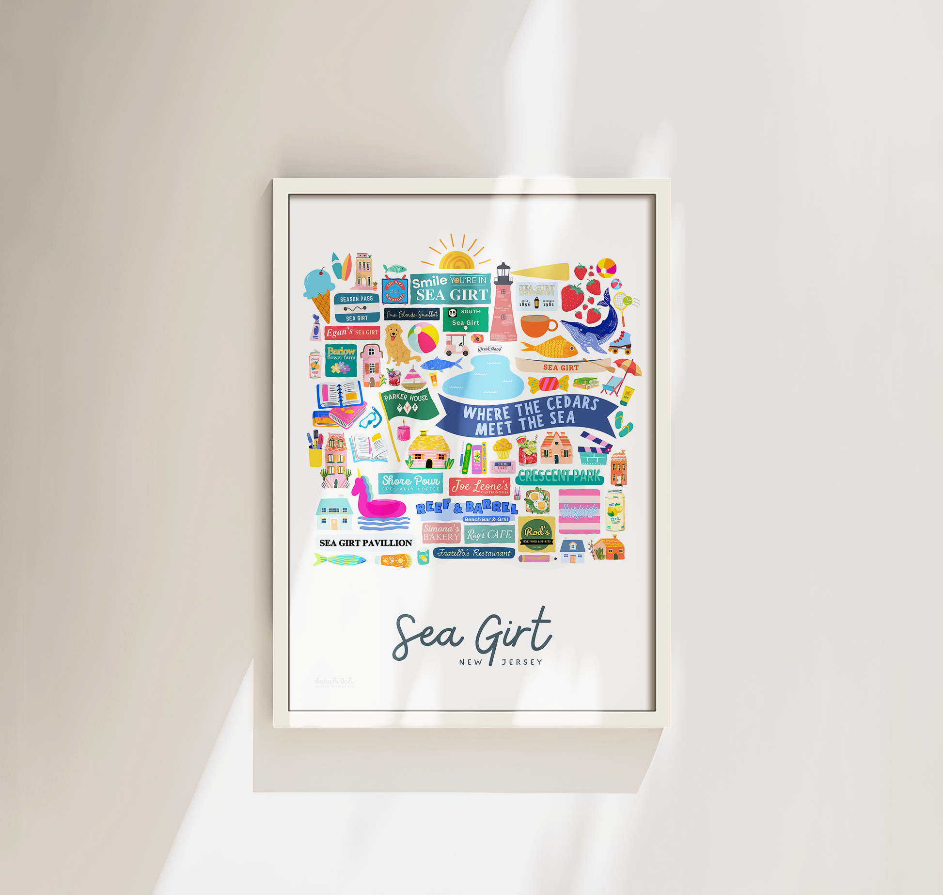 Colorful, custom-designed print featuring local attractions. All prints are printed on glossy photo paper. All framed prints come in a lightweight, white frame.
