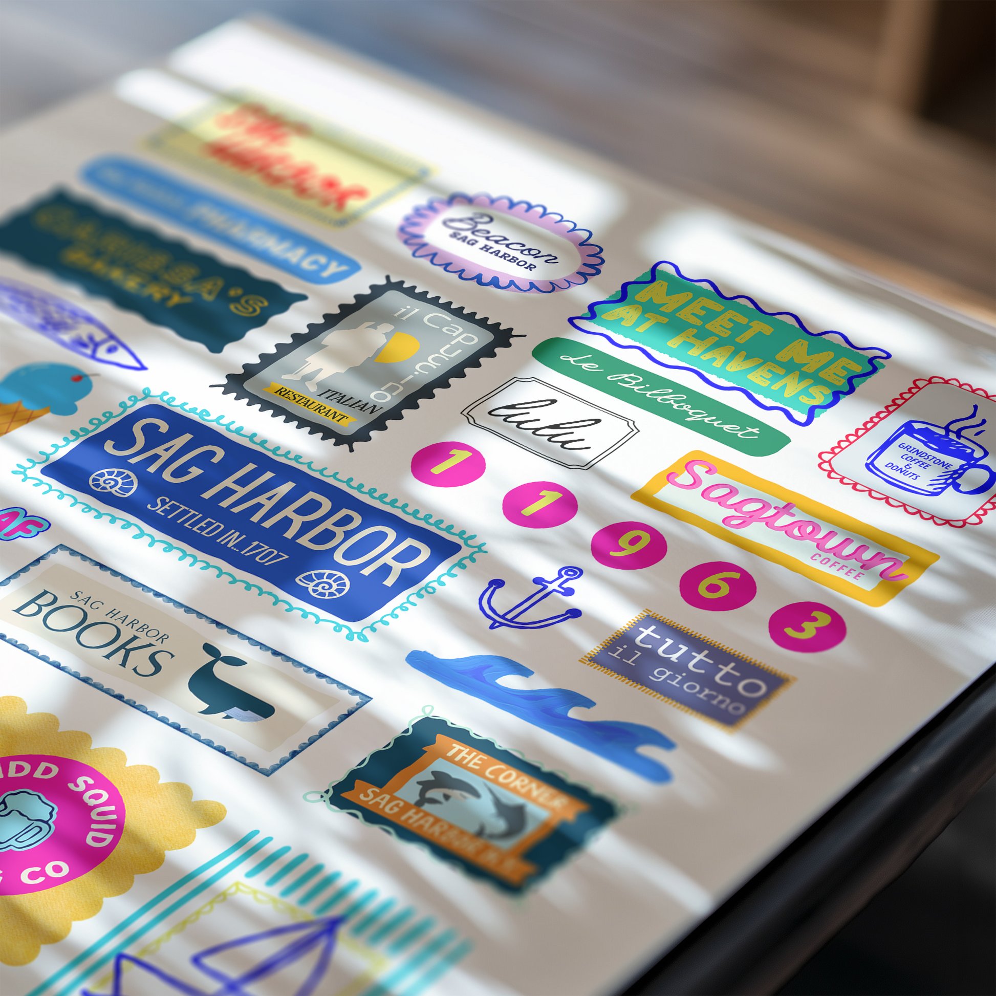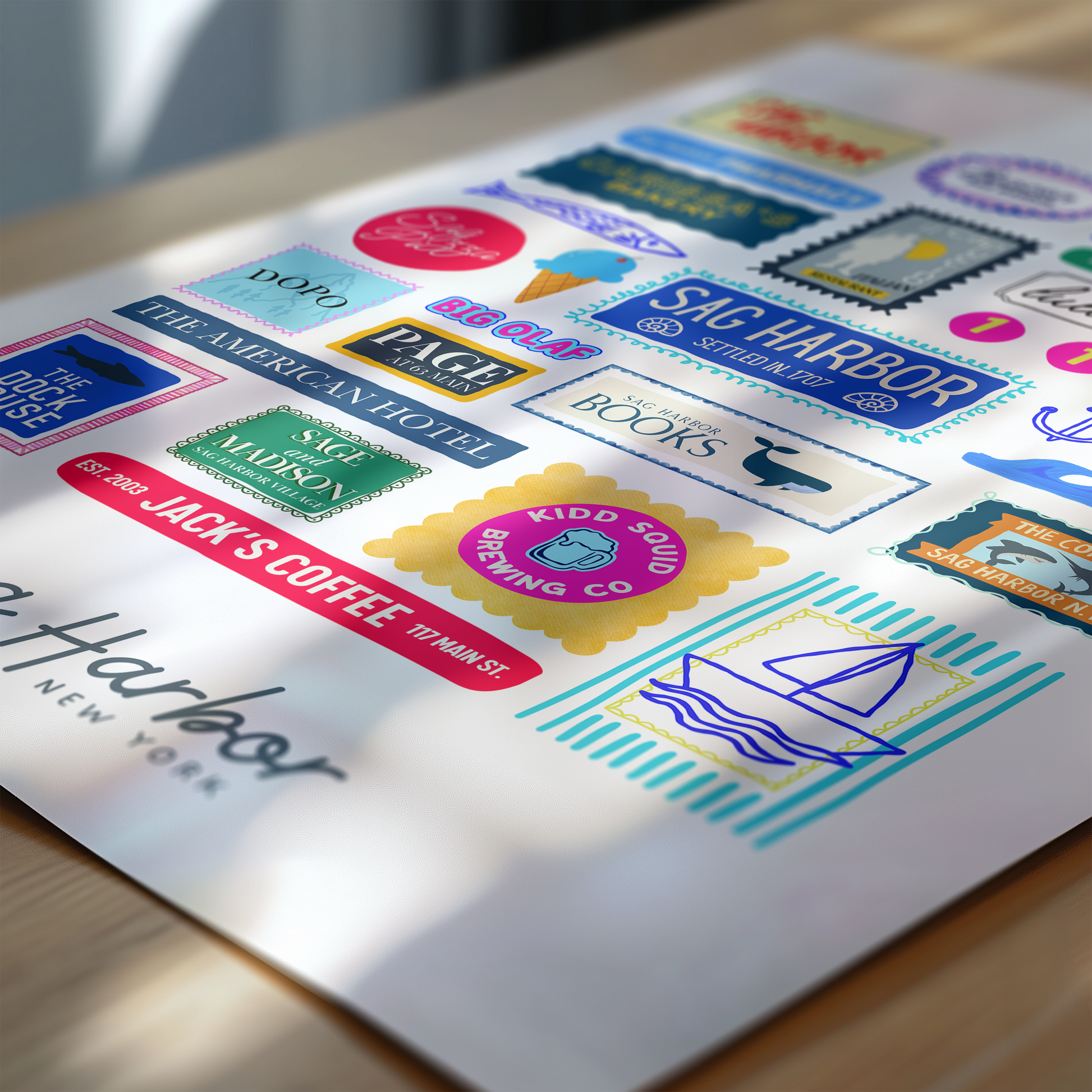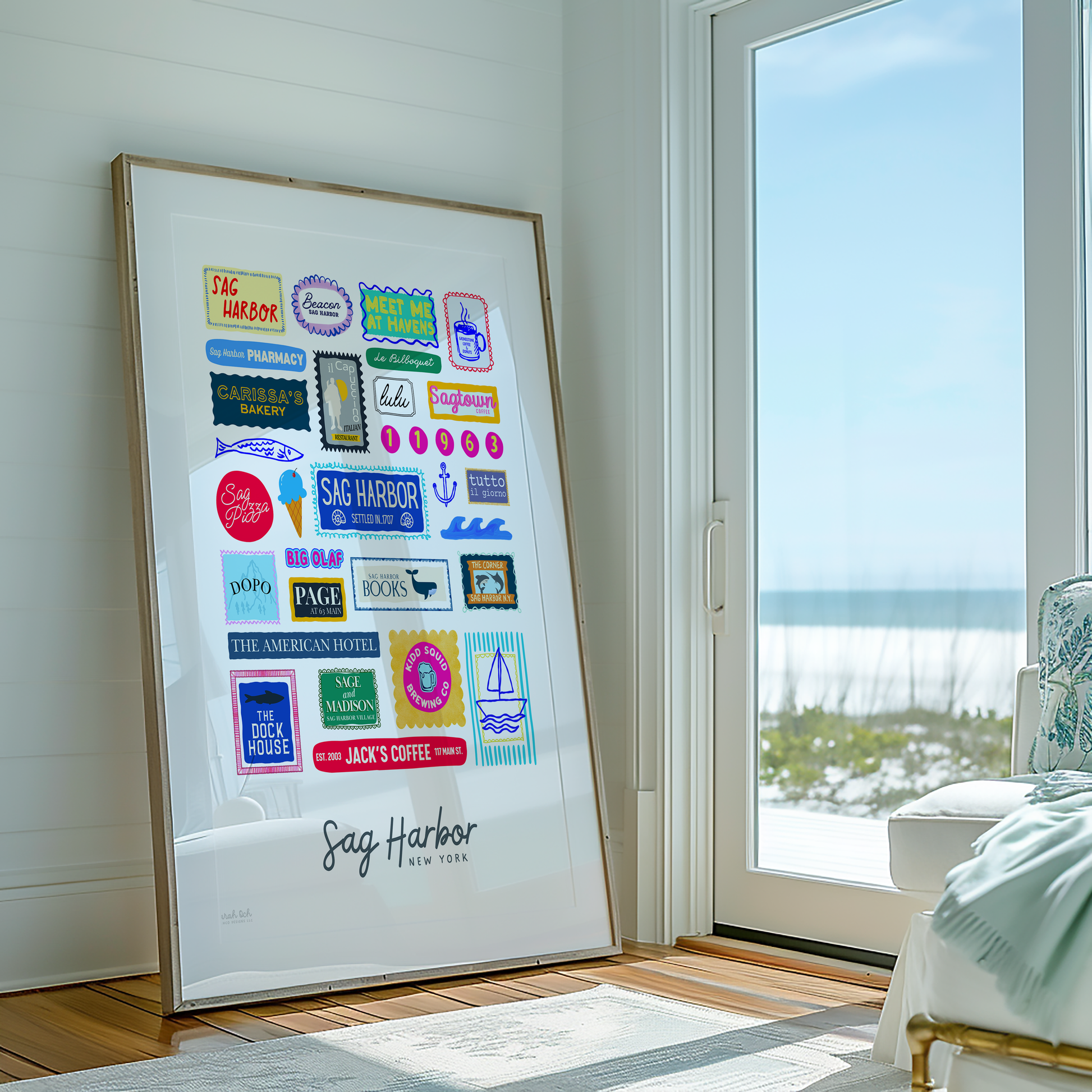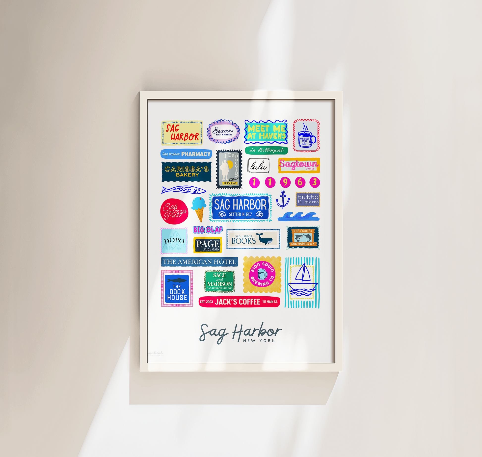 Colorful, custom-designed print featuring local attractions. All prints are printed on glossy photo paper. All framed prints come in a lightweight, white frame.