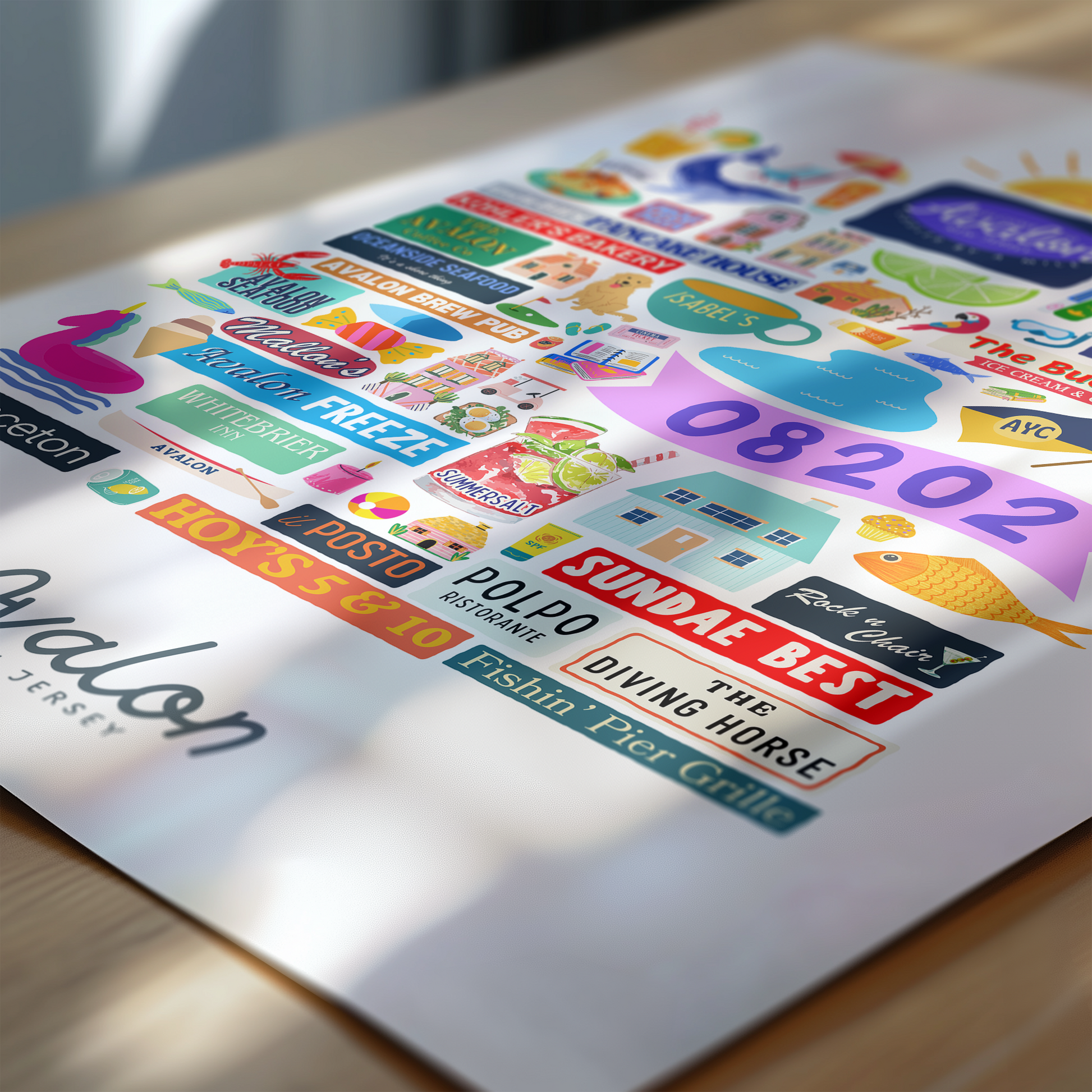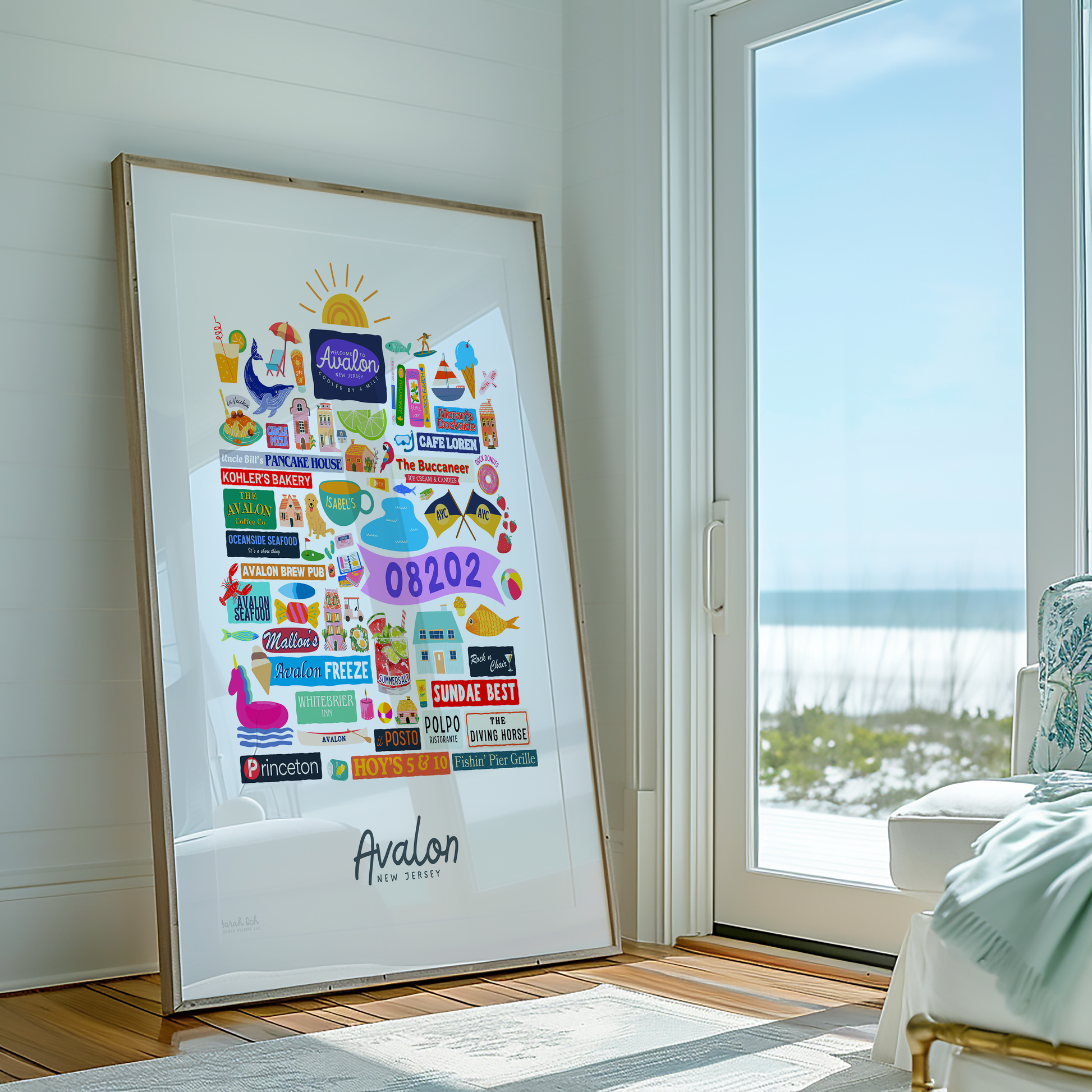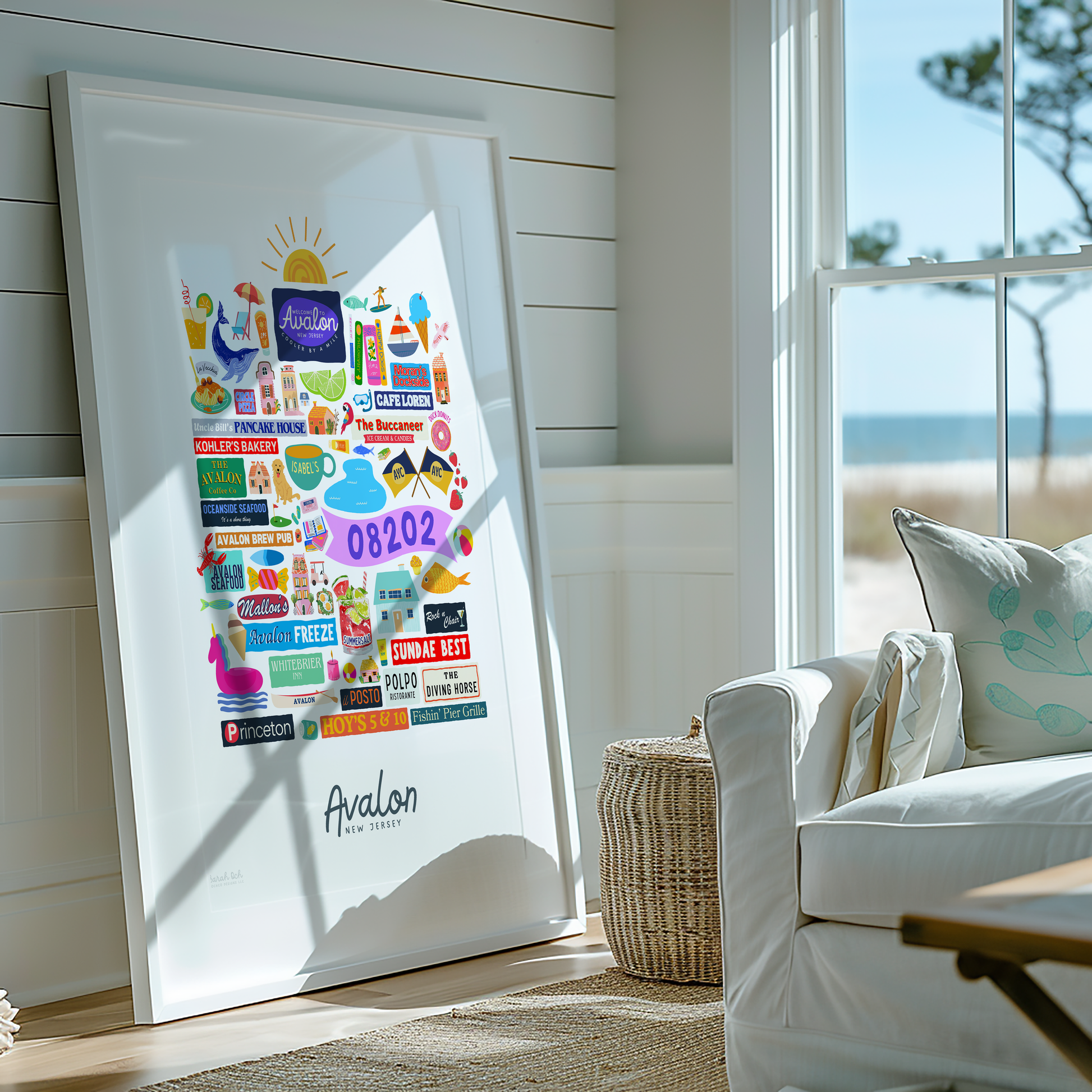 Colorful, custom-designed print featuring local attractions. All prints are printed on glossy photo paper. All framed prints come in a lightweight, white frame.