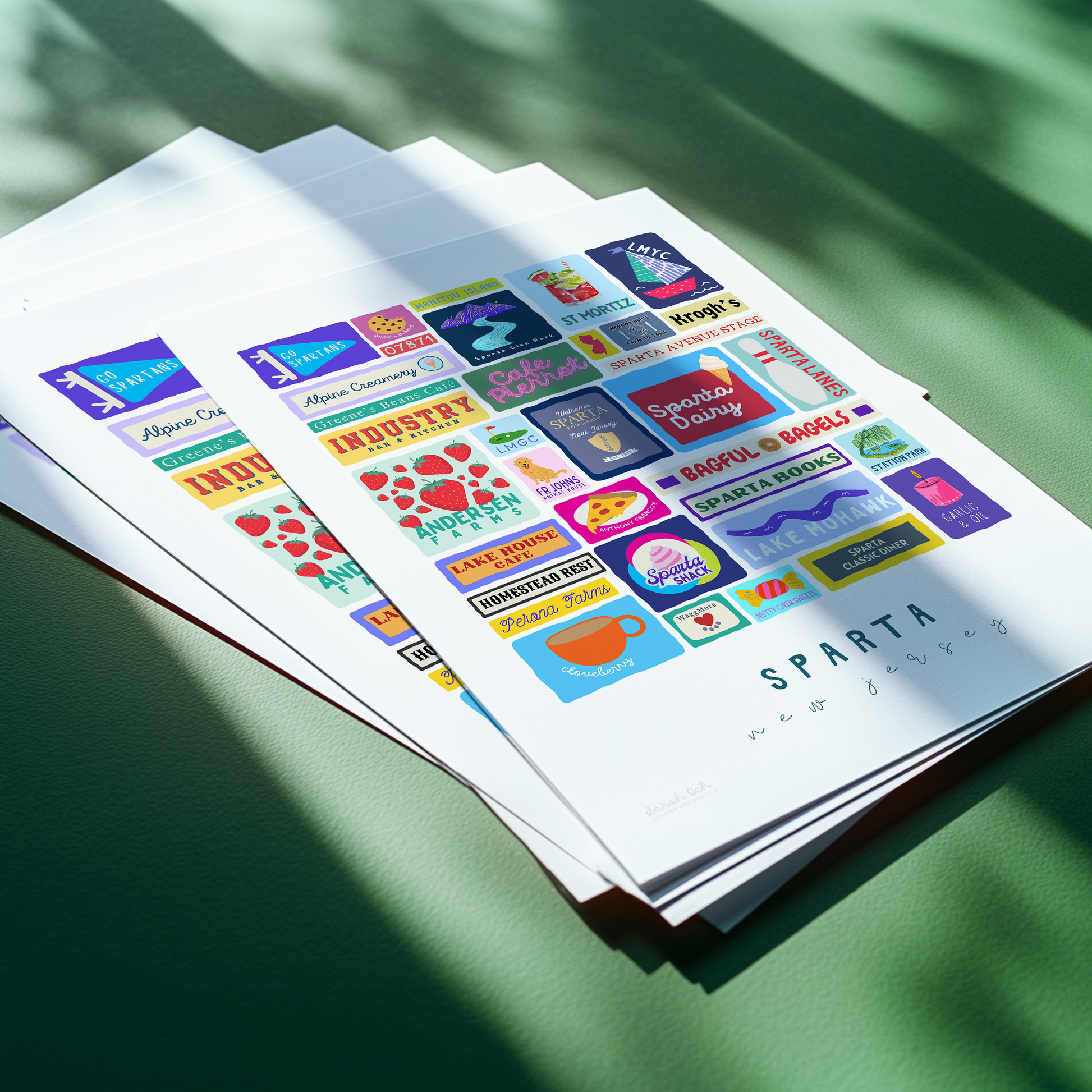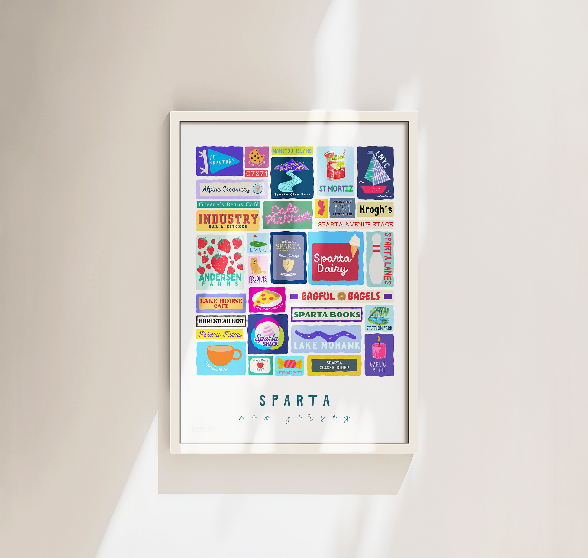 Colorful, custom-designed print featuring local attractions. All prints are printed on glossy photo paper. All framed prints come in a lightweight, white frame.