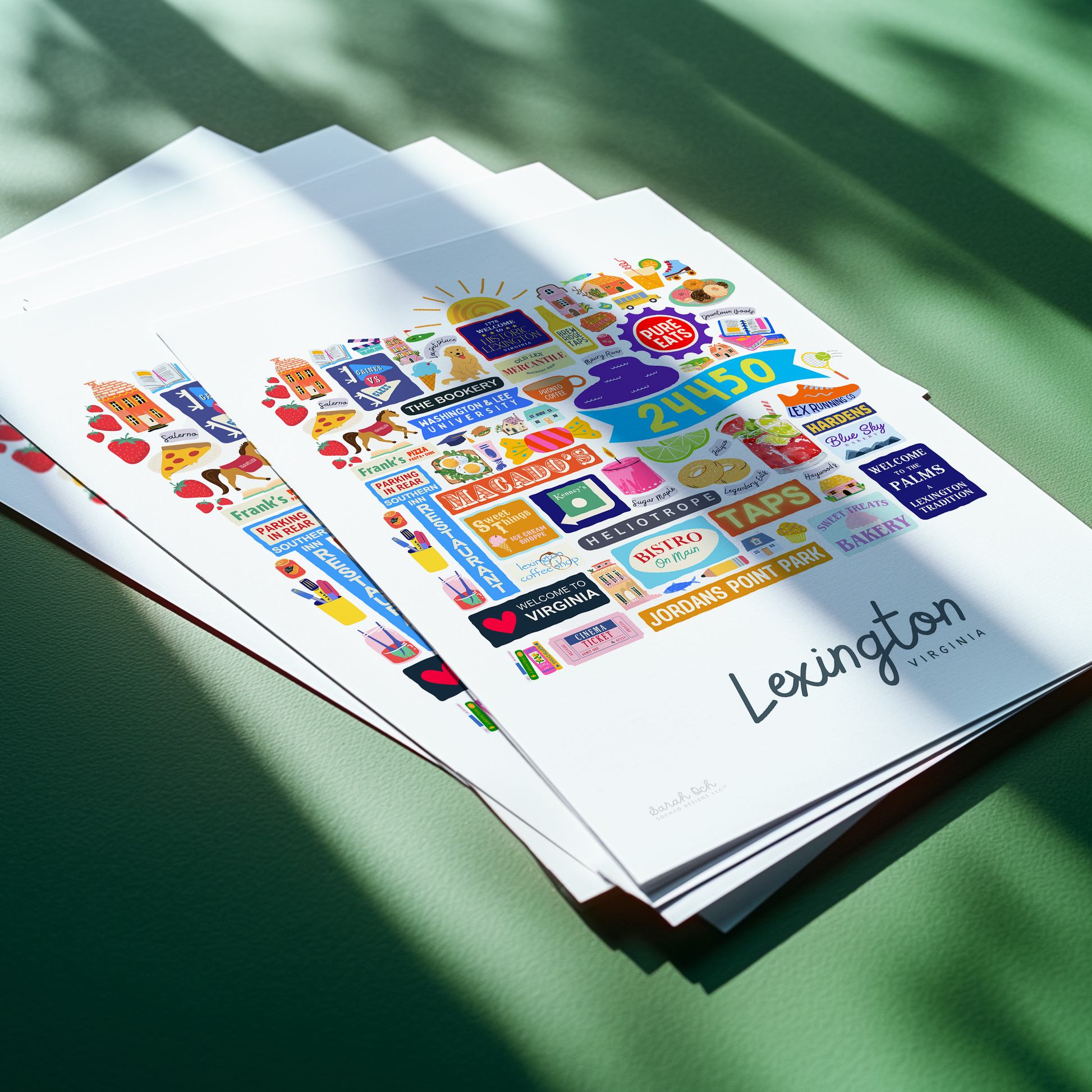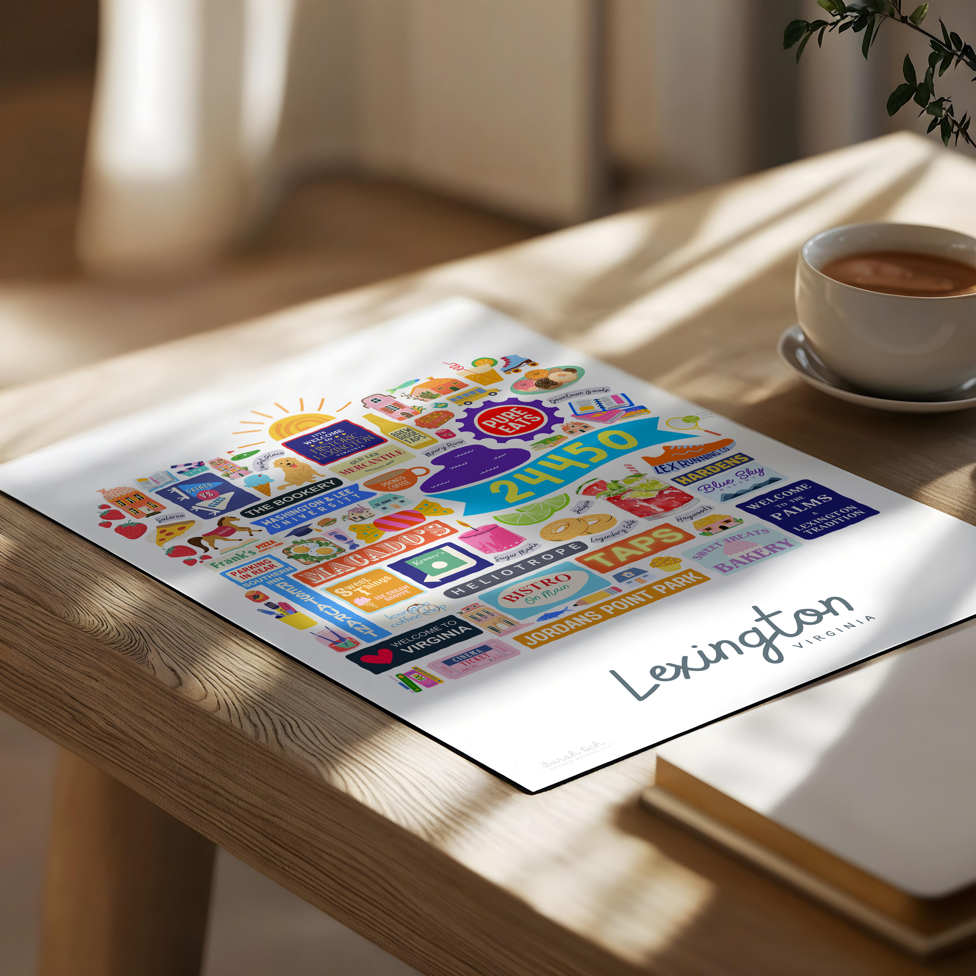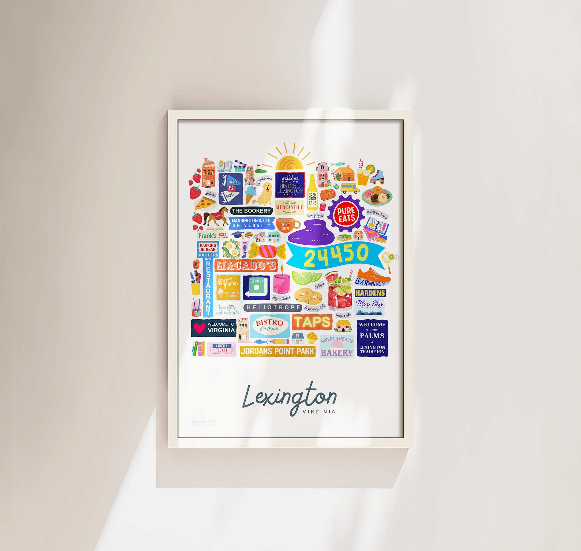 Colorful, custom-designed print featuring local attractions. All prints are printed on glossy photo paper. All framed prints come in a lightweight, white frame.