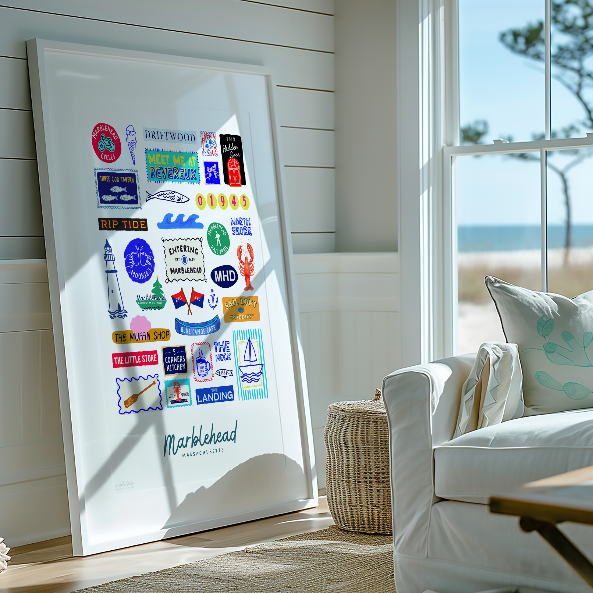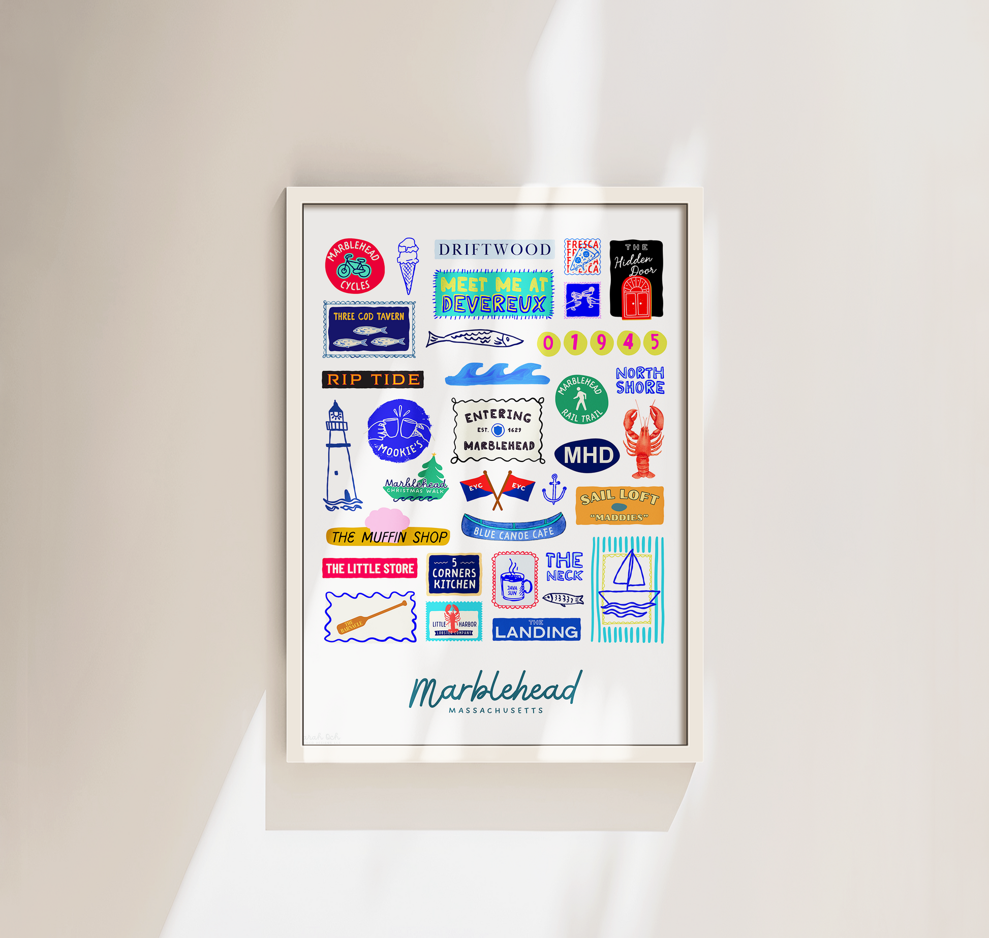 Colorful, custom-designed print featuring local attractions. All prints are printed on glossy photo paper. All framed prints come in a lightweight, white frame.