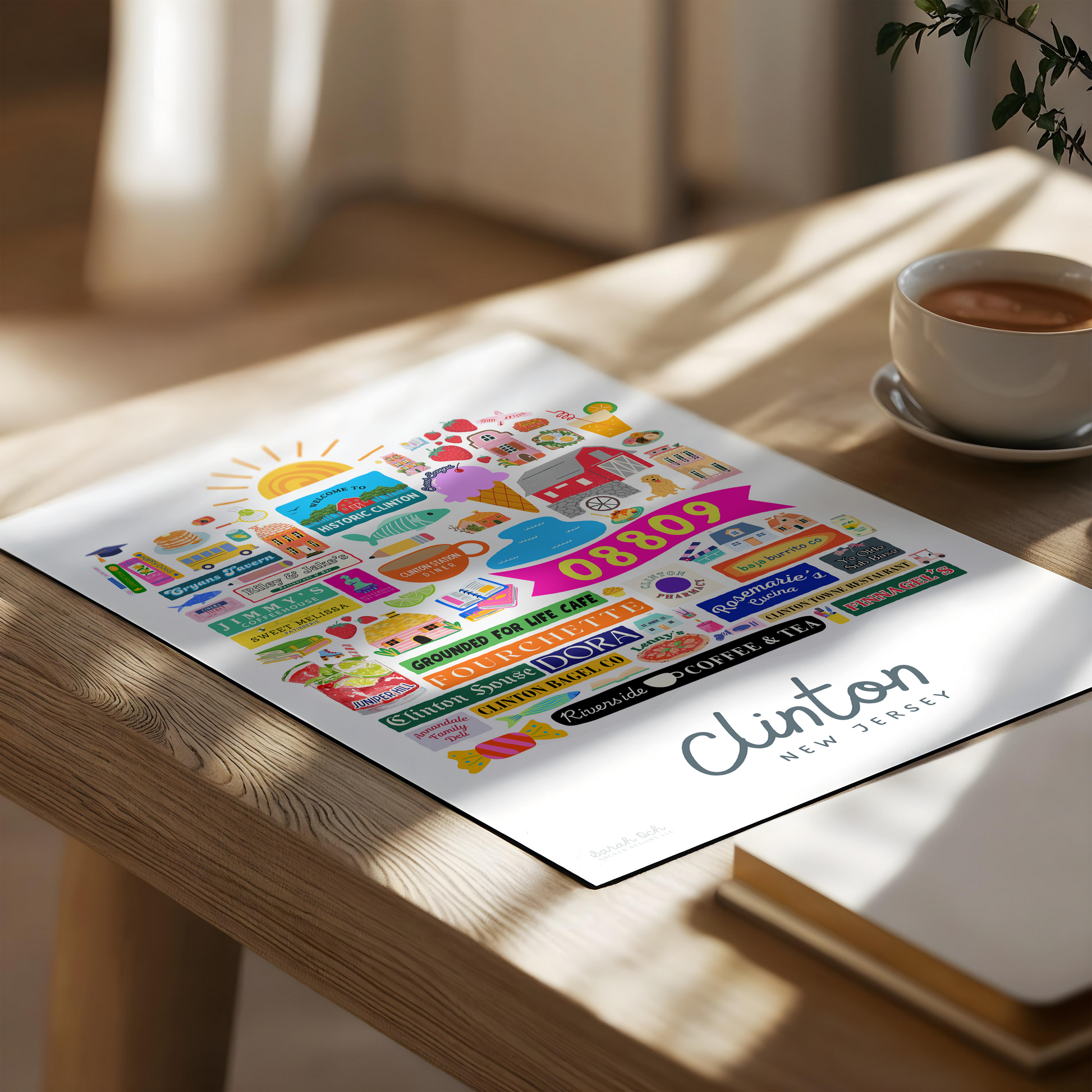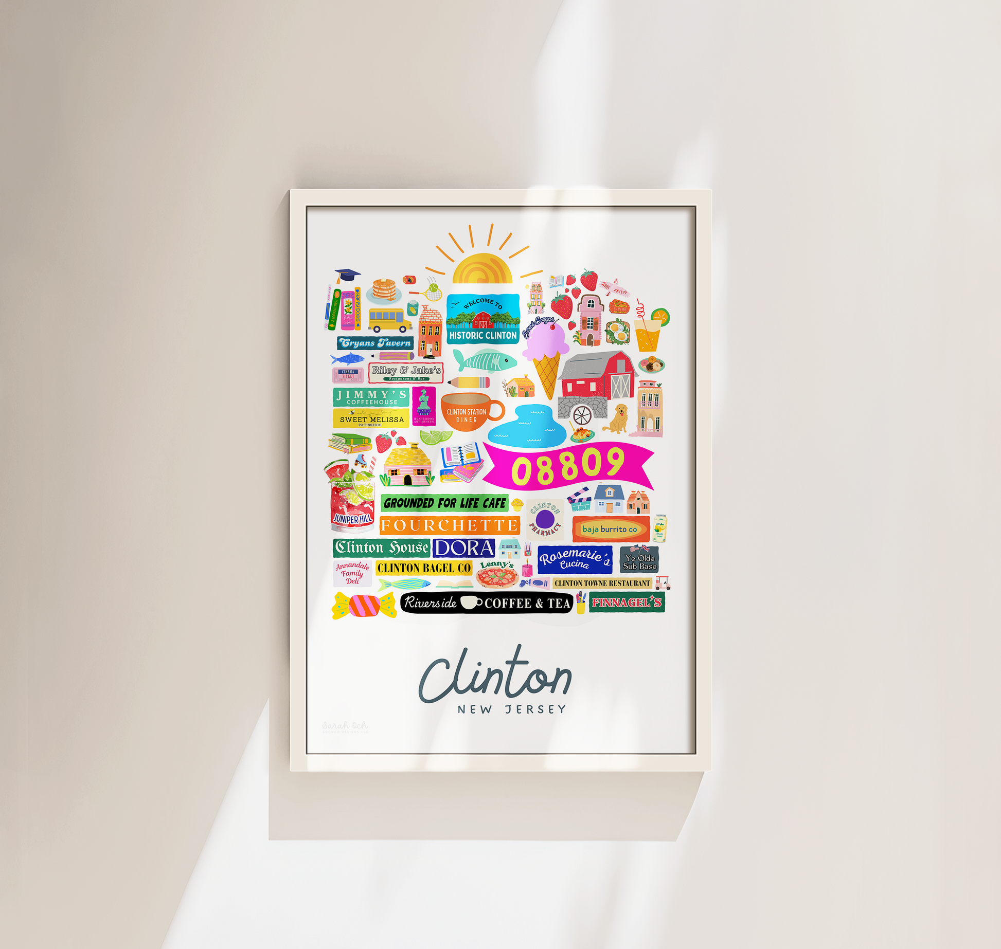 Colorful, custom-designed print featuring local attractions. All prints are printed on glossy photo paper. All framed prints come in a lightweight, white frame.
