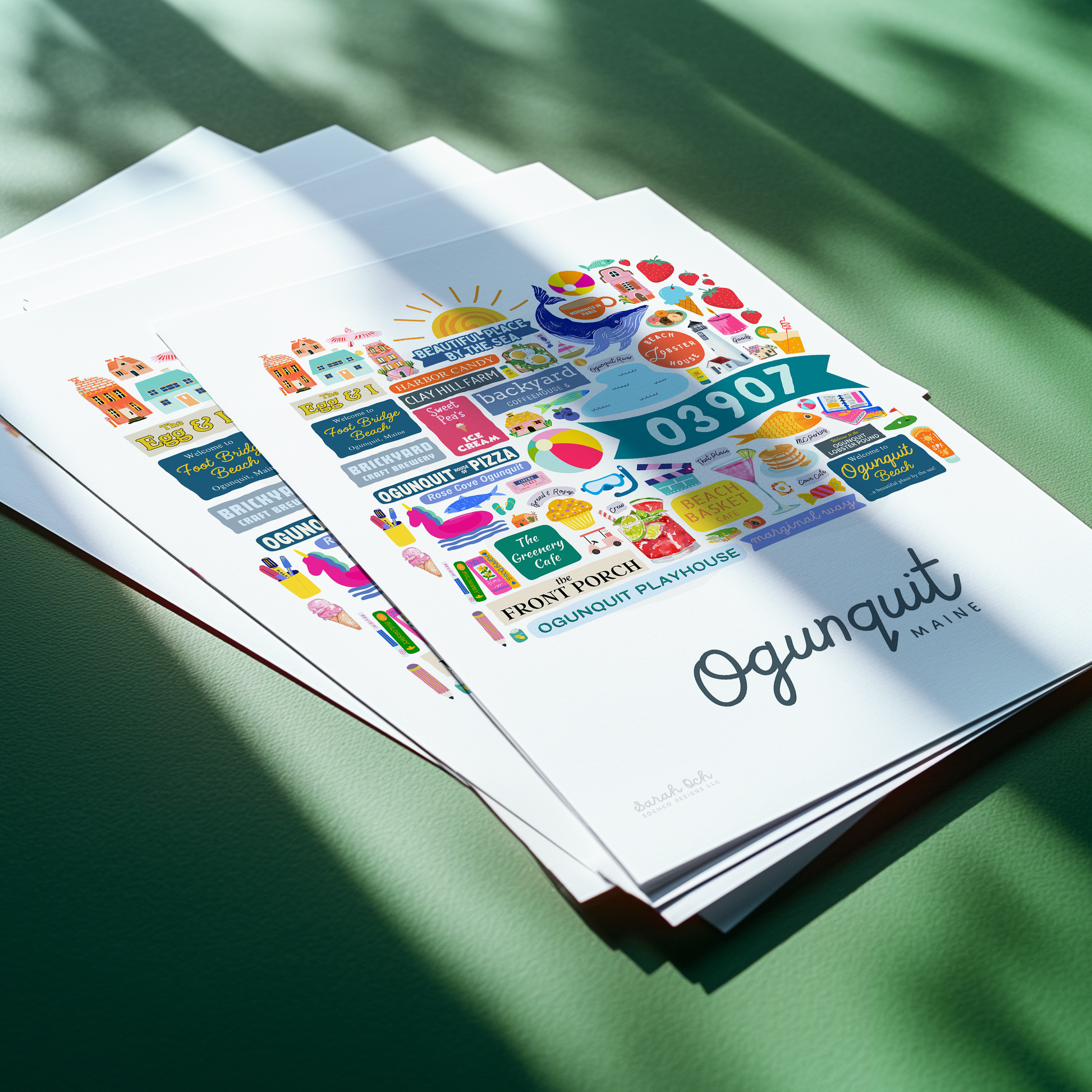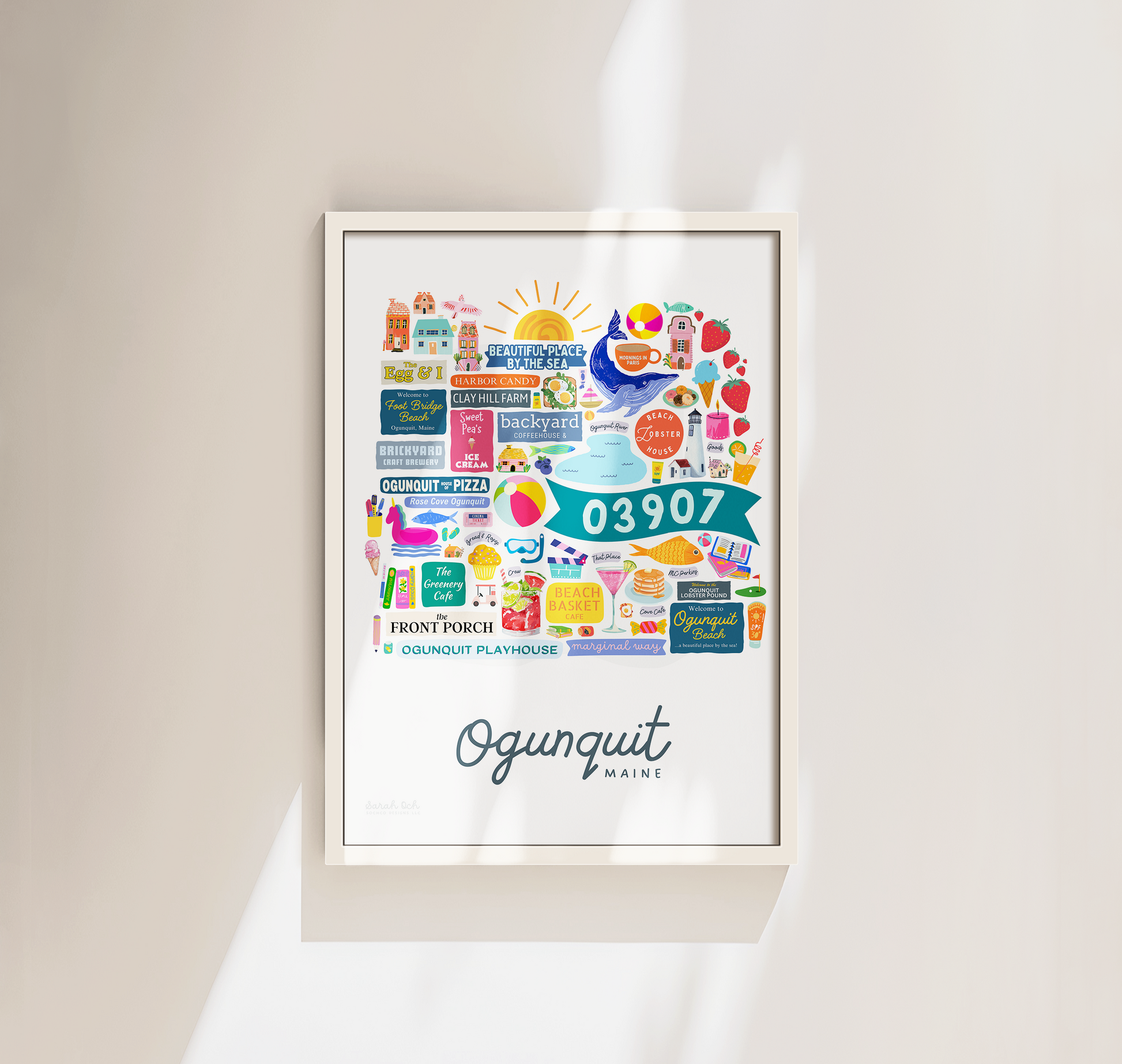 Colorful, custom-designed print featuring local attractions. All prints are printed on glossy photo paper. All framed prints come in a lightweight, white frame.
